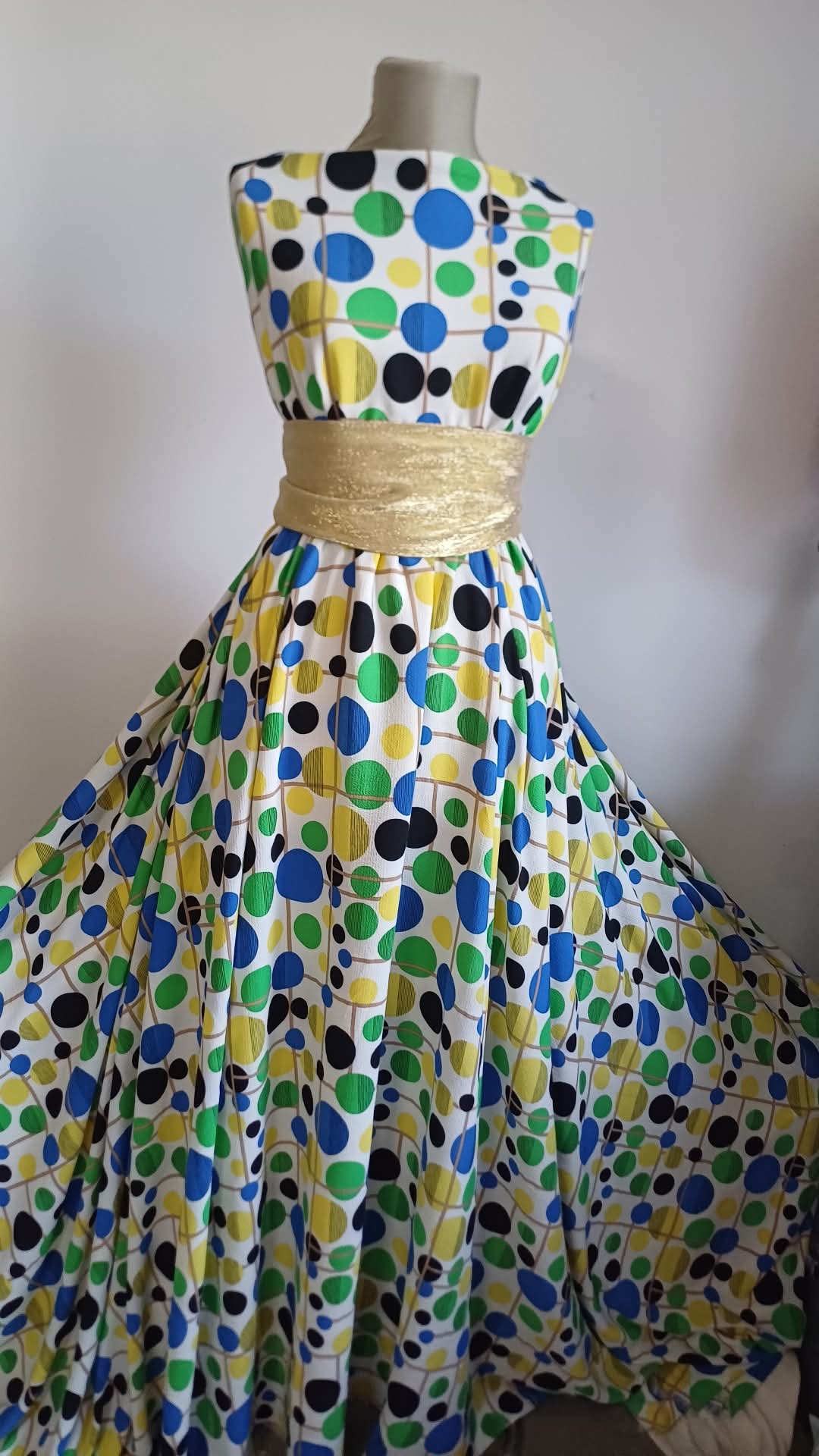 O mătase ușor elastică, cu textură moale și catifelată, acest bubble crepe alb este decorat cu buline jucăușe în nuanțe vesele de galben, albastru și verde. Materialul oferă o cădere delicată și un confort plăcut la purtare, fiind ideal pentru rochii elegante, fuste lejere și bluze rafinate. Perfect pentru ținute care combină feminitatea cu un strop de prospețime și originalitate.