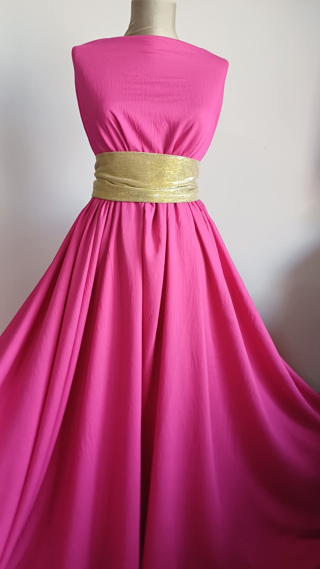 Fucsia – Stofă din Vâscoză este o alegere inspirată pentru garderoba de vară, datorită compoziției sale din fibre vegetale ce oferă o senzație naturală și răcoroasă la purtare. Cu o textură mătăsoasă, fluidă și elegantă, acest material cade frumos pe corp, având o greutate care îi conferă ținută, fără a fi rigid. Nu necesită căptușeală și este ideal pentru rochii cu linii curgătoare, fuste vaporoase, bluze lejere, pantaloni cu croială amplă sau salopete cu aer sofisticat. Nuanța vibrantă adaugă un plus de personalitate oricărui outfit