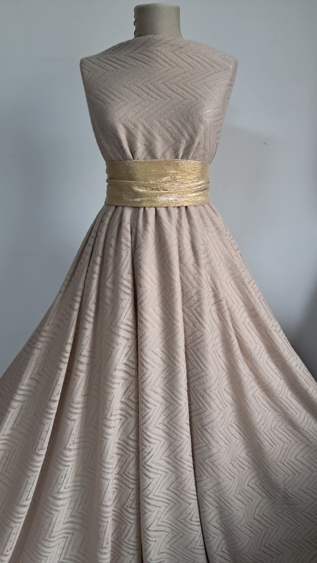 Un tricot tip pulover cu textură moale și confortabilă, în nuanță luminoasă de bej deschis, pus în valoare de un model subtil în V. Material elastic, cu o ținută lejeră și plăcută pe piele, perfect pentru ținute cozy, dar stilate. Ideal pentru rochii, fuste, bluze, malete, cardigane, turbane sau șaluri. O alegere inspirată pentru creații cu un aer casual-elegant și un plus de căldură.