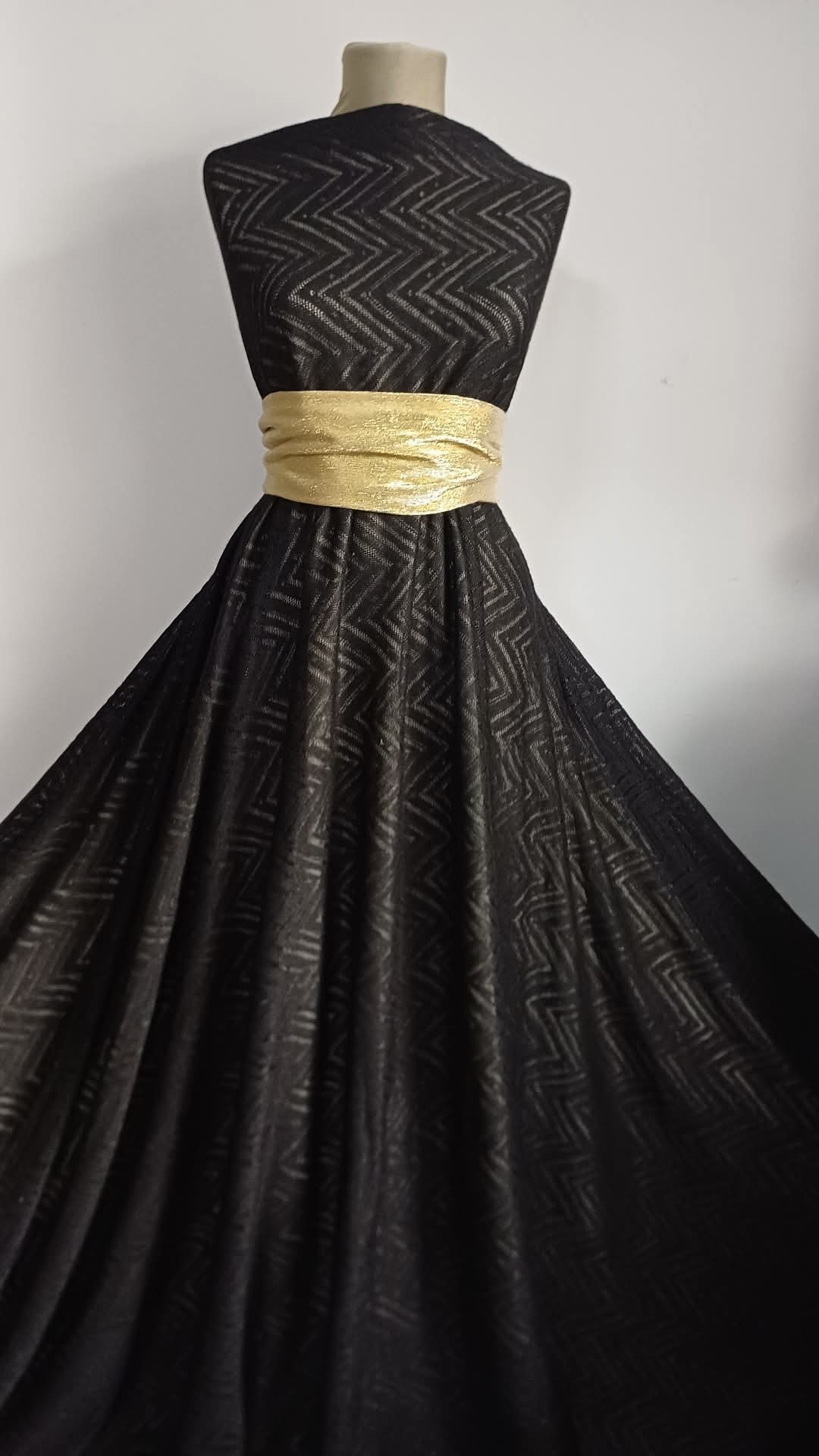 Un clasic atemporal, acest tricot tip pulover dantelat în nuanță de negru profund impresionează prin eleganța modelului în V și textura sa moale, cu elasticitate confortabilă. Este alegerea perfectă pentru rochii sofisticate, fuste cu linie fluidă, bluze minimaliste sau malete cu un aer rafinat. De asemenea, se pretează excelent la realizarea de cardigane versatile, turbane chic sau șaluri cu un plus de mister și eleganță. O bază esențială pentru garderoba de toamnă-iarnă, acest material adaugă finețe oricărei creații.