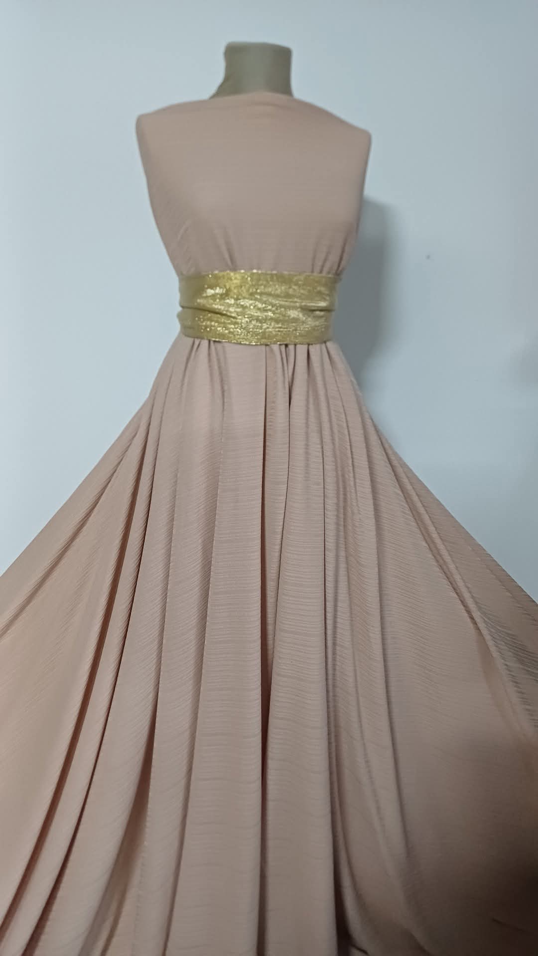 Un material moale și elastic, cu un model subtil de dungulițe care adaugă textură și finețe. Nuanța caldă de bej nude îl face extrem de versatil, potrivit pentru ținute comode și elegante deopotrivă. Ideal pentru malete, rochii lejere, fuste, bluze, pantaloni largi, dar și pentru accesorii precum turbane, căciulițe, bentițe sau chiar pijamale. O alegere practică și estetică pentru piese confortabile cu stil.