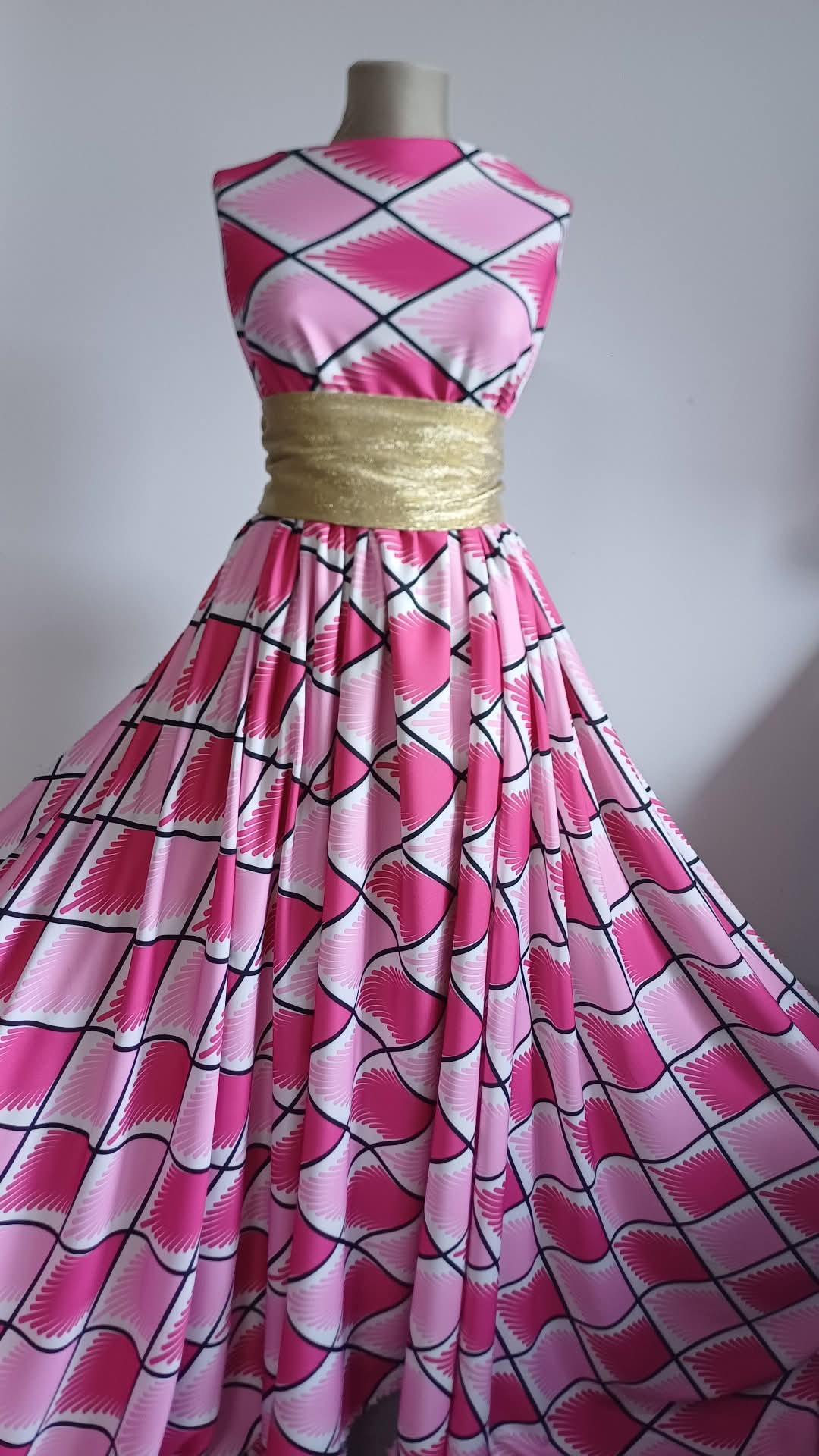 Un material modern și plin de personalitate, cu un imprimeu grafic rafinat ce îmbină romburi negre și evantaie roz pe un fond alb luminos. Această stofă elastică se remarcă prin confortul la purtare, nu necesită căptușeală și nu se șifonează, oferind lejeritate și stil. Ideală pentru rochii elegante, bluze statement, fuste cu croieli fluide, pantaloni, salopete, cardigane și costume de vară cu un aer proaspăt și creativ.