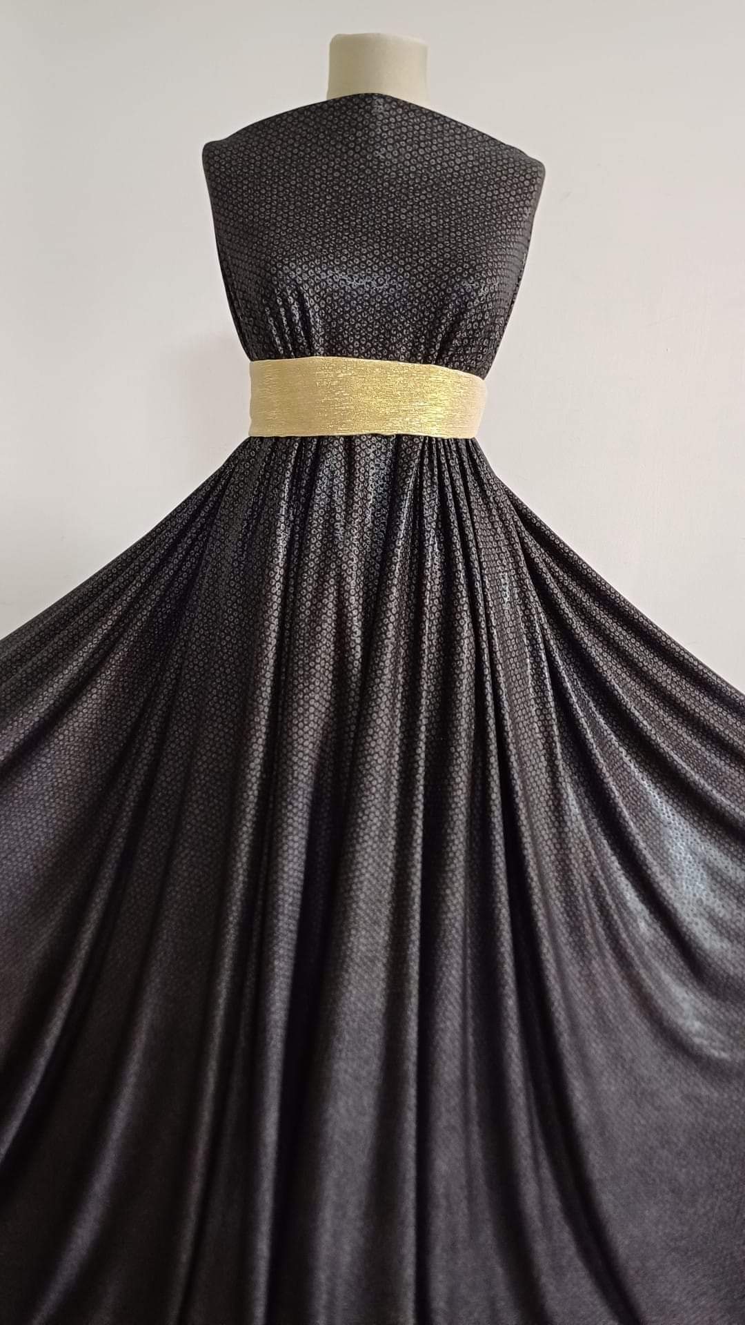 Lycra Negru cu Model Sidefat "Boabe de Cafea", provenind din Coreea, este un material versatil și sofisticat, ideal pentru rochii cu drapaje, fuste, bluze, colanți, costume de baie și decorațiuni. Caracterizat printr-un model elegant de boabe de cafea și un finisaj sidefat, acest lycra oferă un aspect luxos și atrăgător. Elasticitatea și durabilitatea materialului asigură confort și o potrivire perfectă, făcându-l potrivit pentru diverse articole vestimentare și proiecte creative.
