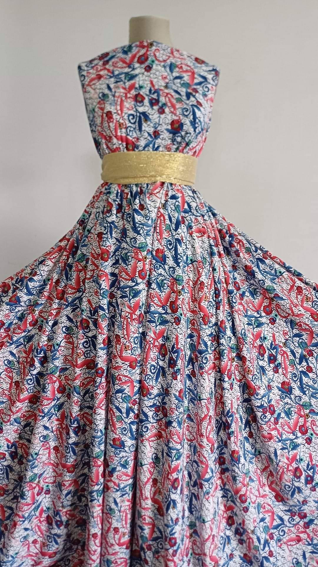 Mătase Elastica Alba cu Flori si Frunze Rosu/Albastr/Turcoaz moale și catifelata la pipăit, bună pentru rochii, fuste, bluze, pantaloni, salopete. Nu se sifoneaza, nu necesita căptușeală