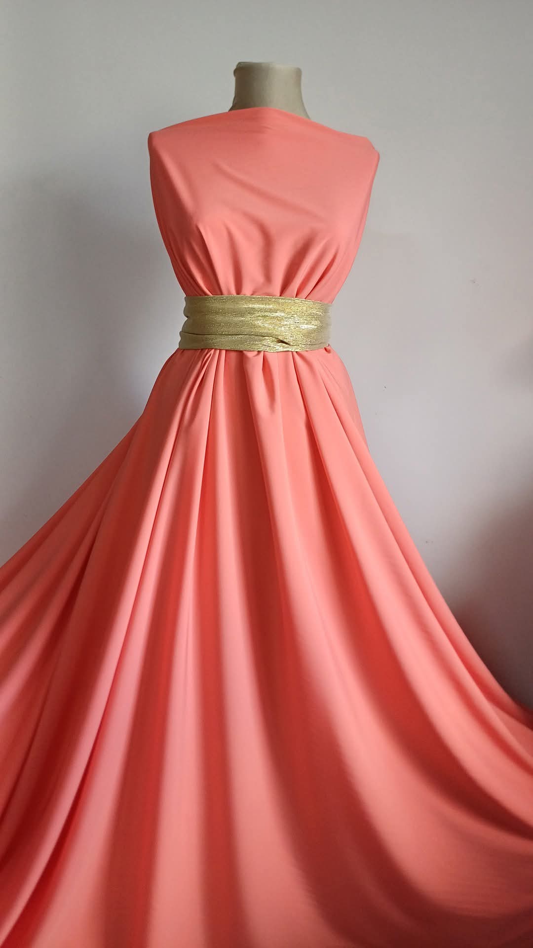 Această mătase elastică în nuanță somon este moale, catifelată la atingere și extrem de plăcută pe piele. Materialul nu se șifonează și nu necesită căptușeală, fiind ideal pentru rochii fluide, fuste elegante sau bluze delicate. Perfectă pentru creații feminine, cu un plus de rafinament și confort.