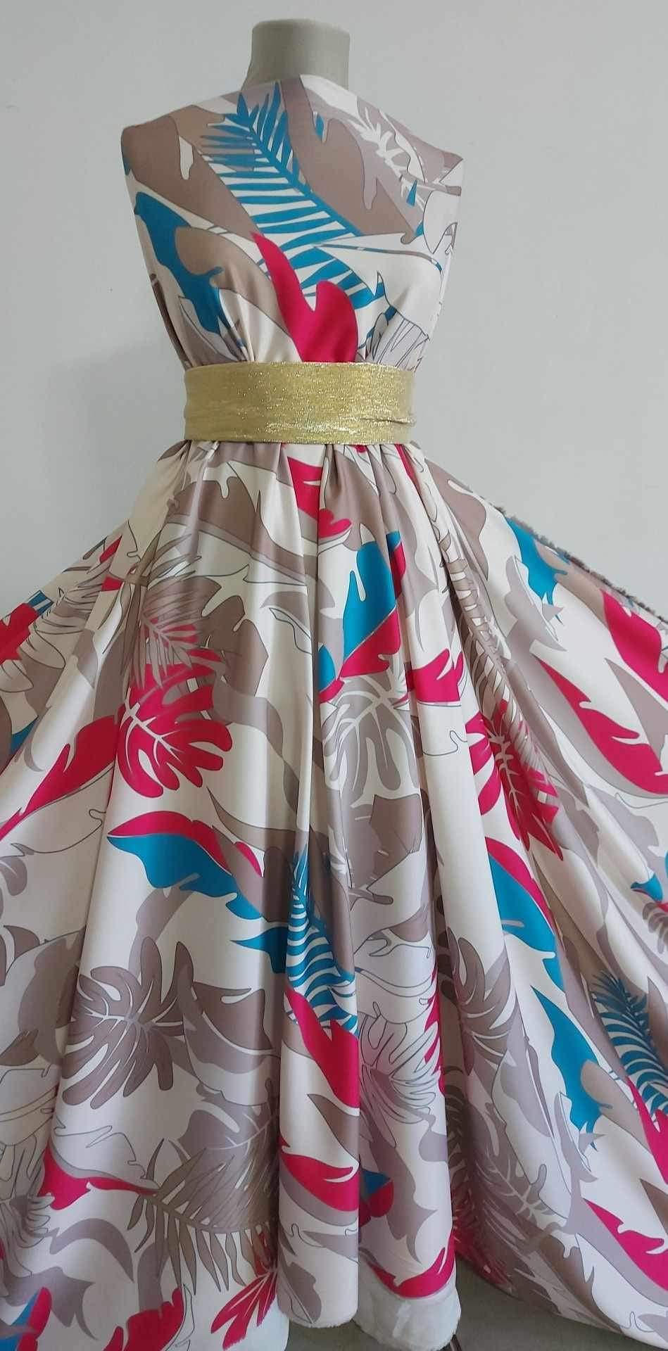 Matase Imprimeu Frunze Exotice Bej/Albastru/Rosu , elastica, plină, nu necesită căptuseala, bună pentru rochii, bluze, fuste, eșarfe