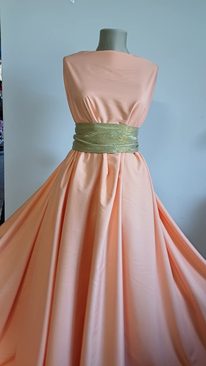 Un material cu un farmec aparte, în nuanță caldă de piersiciu, ce inspiră delicatețe și rafinament. Fața sa are un finisaj cu puf fin, catifelat la atingere, iar dosul ușor satinat adaugă un plus de eleganță. Este o mătase plină, netransparentă, care nu se șifonează și oferă o ținută impecabilă în orice croi. Ideală pentru rochii, fuste, bluze, pantaloni, salopete sau cardigane, această țesătură conferă confort și stil în egală măsură.