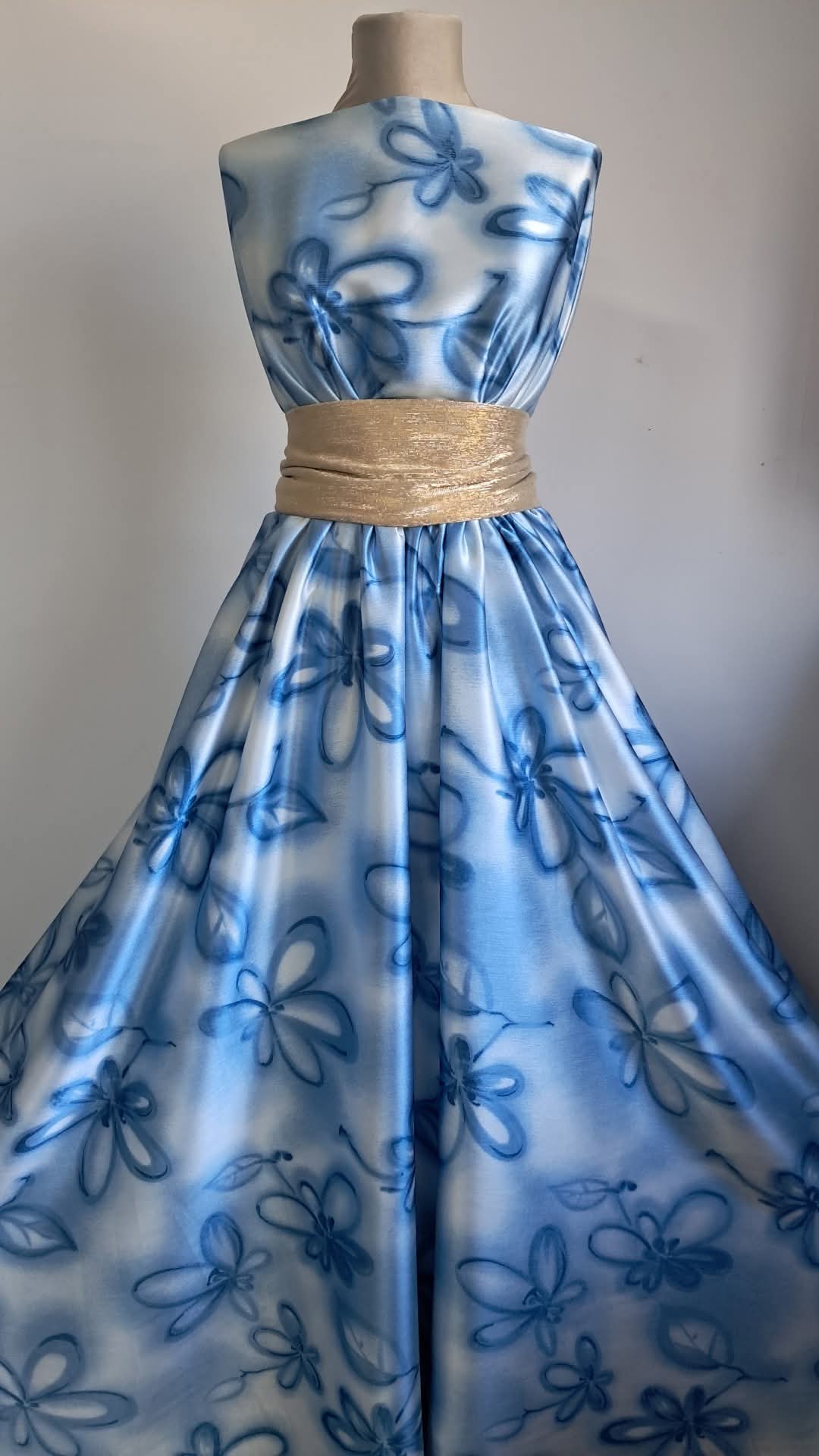 Mătase satinată cu flori stilizate în nuanțe de albastru, bleo și alb
