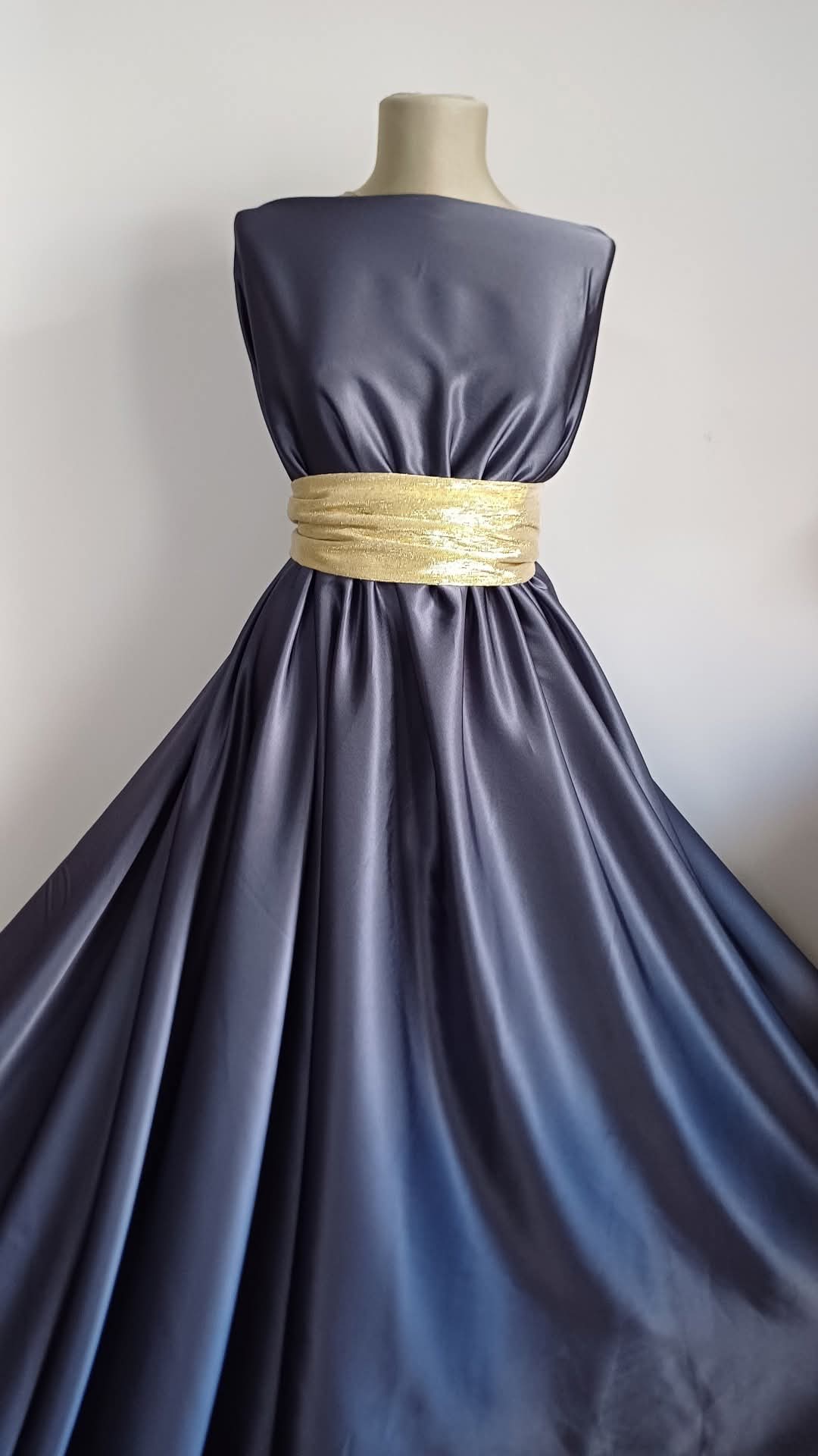 Această mătase satinată într-o nuanță sofisticată de gri petrol se remarcă prin densitatea sa, finețea la atingere și elasticitatea ușoară care asigură confort la purtare. Nu necesită căptușeală și nu se șifonează, fiind alegerea ideală pentru rochii elegante, fuste fluide, bluze, cămăși, caftane, pijamale sau halate cu un aspect rafinat și luxos. Un material versatil și de înaltă calitate pentru creații cu stil.