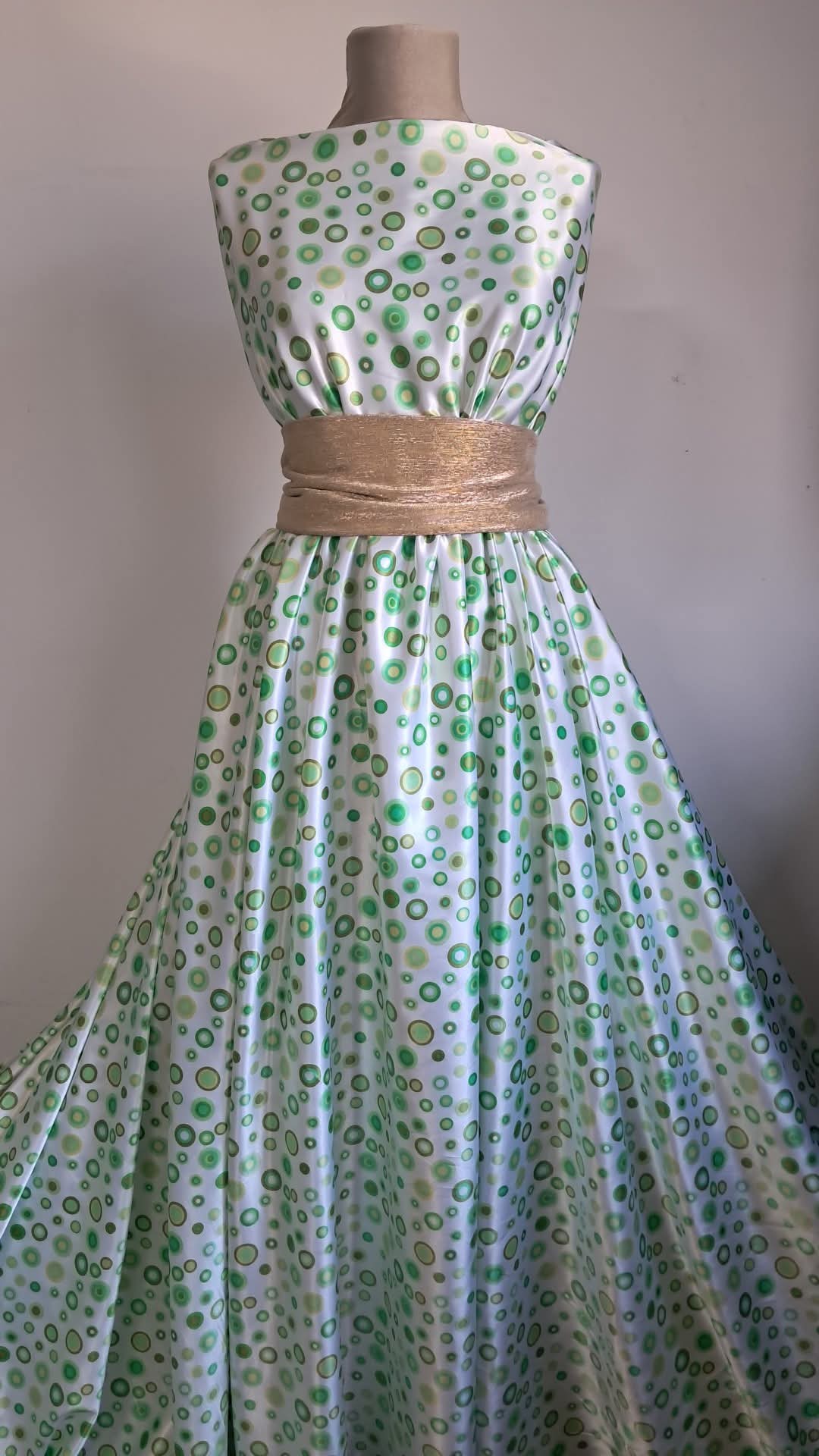 Un material satinat de o calitate superioară, cu o textură plină și catifelată, ce îmbină eleganța cu un strop de veselie grafică. Imprimeul cu cerculețe colorate adaugă dinamism, iar elasticitatea oferă un plus de confort. Nu necesită căptușeală și se așază frumos pe corp, fiind ideală pentru rochii fluide, fuste, bluze, pantaloni, salopete, halate lejere sau pijamale cu un aer seducător și modern.