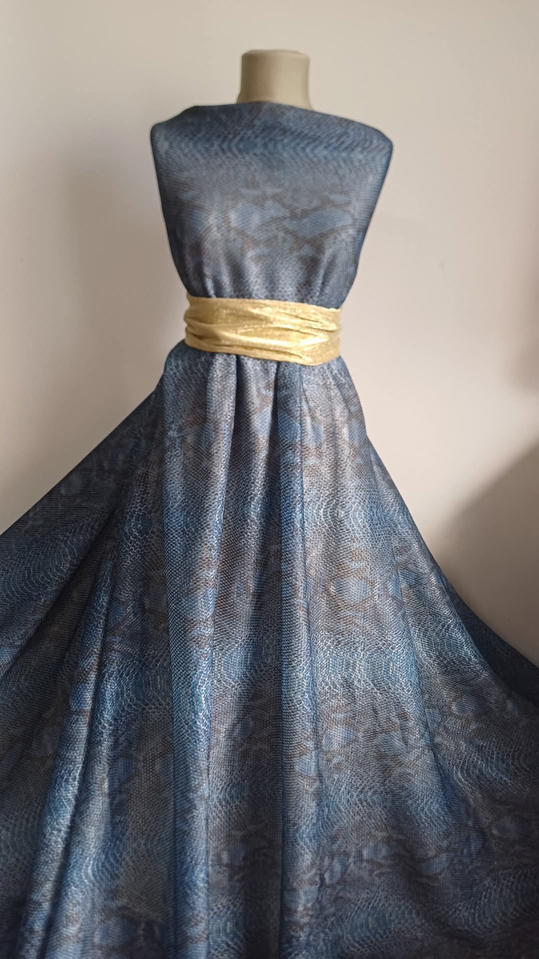 Un material spectaculos cu aspect de neopren sub formă de plasă, Airtex Mesh impresionează prin textura sa aparte și designul îndrăzneț în nuanțe de albastru și negru cu efect piele de șarpe. Ideal pentru rochii statement, fuste cu volum, bluze expresive sau ținute de podium care atrag toate privirile. Cu o structură ce conferă ținutelor un plus de dramatism și stil avangardist, acest material este alegerea perfectă pentru creații vestimentare îndrăznețe și moderne.