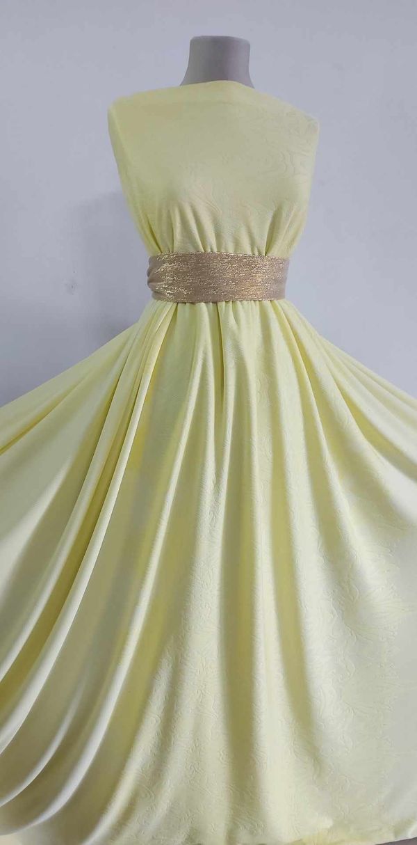 Materialul elastic texturat în galben lămâie, cu model bordură florală ușor în relief și panouri de 1.3 metri lungime, sună absolut captivant și versatil. Iată câteva motive pentru care acest material ar fi perfect pentru rochii, fuste, bluze și articole de sport: