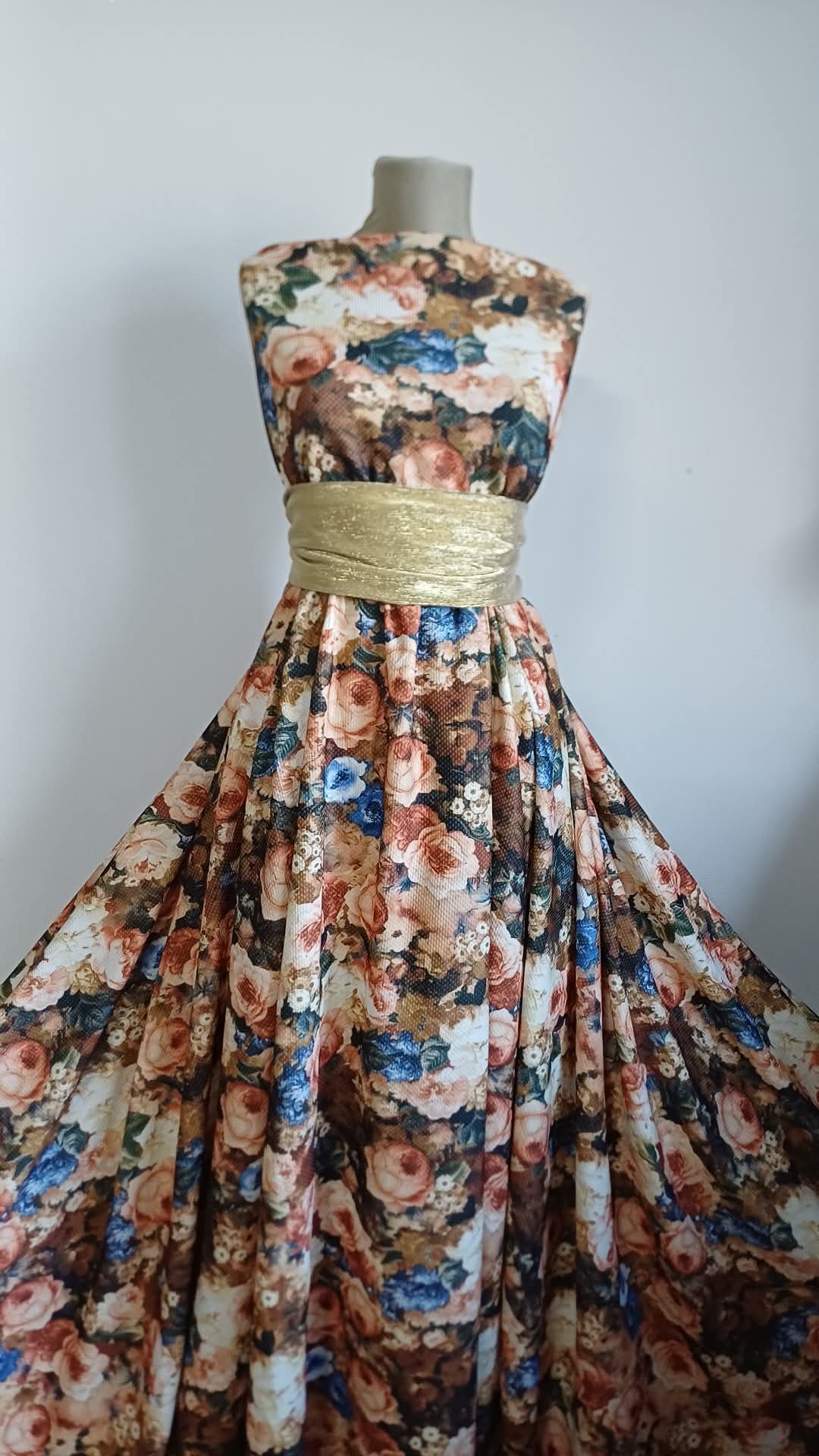 Un material elegant și romantic, îmbogățit cu un imprimeu floral de trandafiri în nuanțe calde de bej, cărămiziu și accente rafinate de albastru. Țesătura elastică și ușor texturată se așază frumos pe corp, îmbrăcând armonios formele și oferind un plus de confort la purtare. Nu necesită căptușeală, fiind ușor de lucrat și ideală pentru rochii, fuste, bluze sau pantaloni. Un material versatil, perfect pentru creații feminine, delicate și pline de farmec.