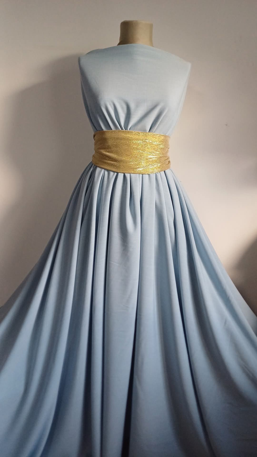 Un material rafinat și elegant, cu o textură subtilă și un ton bleu delicat, evidențiat de firișoarele fine care îi conferă un aspect sofisticat. Este ușor elastică și prezintă două fețe identice, oferind versatilitate și confort în croială. Ideală pentru rochii, fuste, salopete, pantaloni sau sacouri, potrivită atât pentru creații feminine cât și masculine.