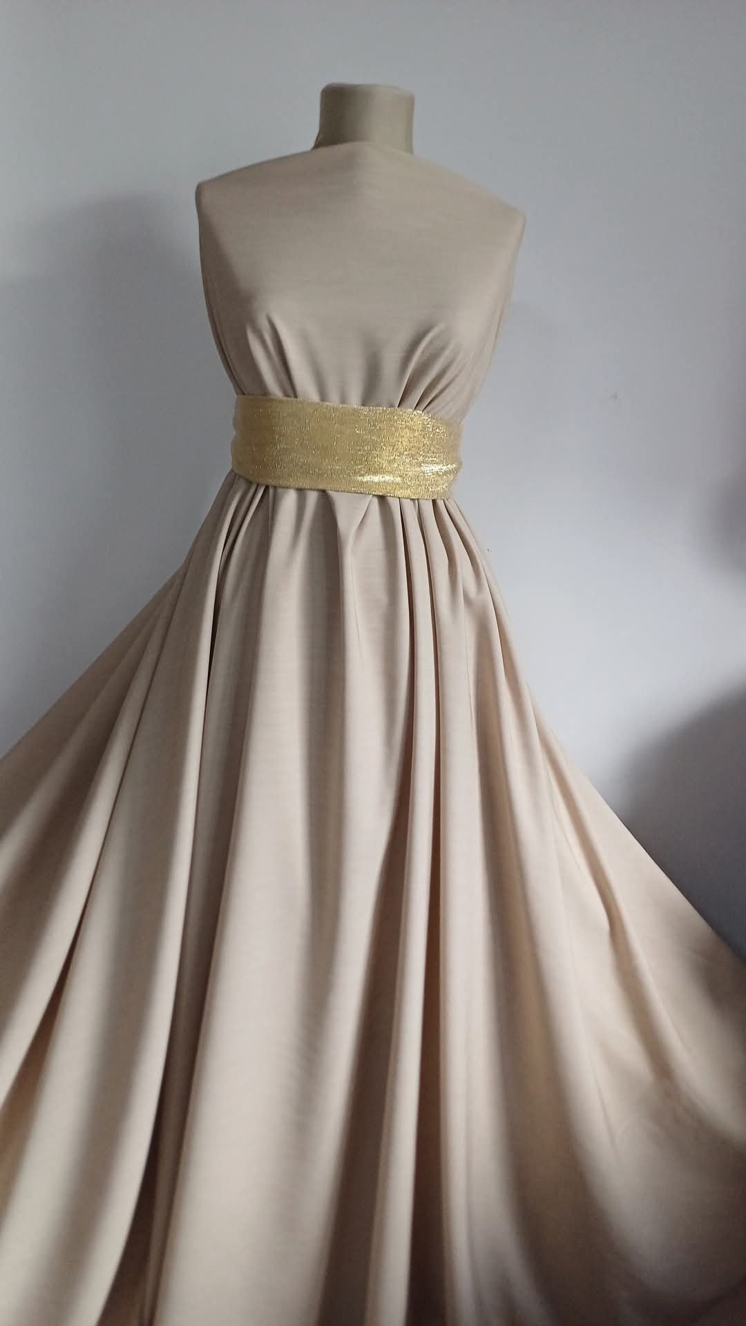 Stofă rafinată din colecția Milano, într-o nuanță elegantă de bej, cu elasticitate și două fețe distincte: una cu firișoare mai închise, cealaltă într-o tentă mai deschisă. Materialul are o ținută frumoasă, nu se șifonează și nu necesită căptușeală, fiind ușor de prelucrat. Ideal pentru rochii, fuste, pantaloni, salopete și sacouri, atât pentru damă cât și pentru bărbați. O alegere modernă și versatilă pentru ținute bine structurate și confortabile.