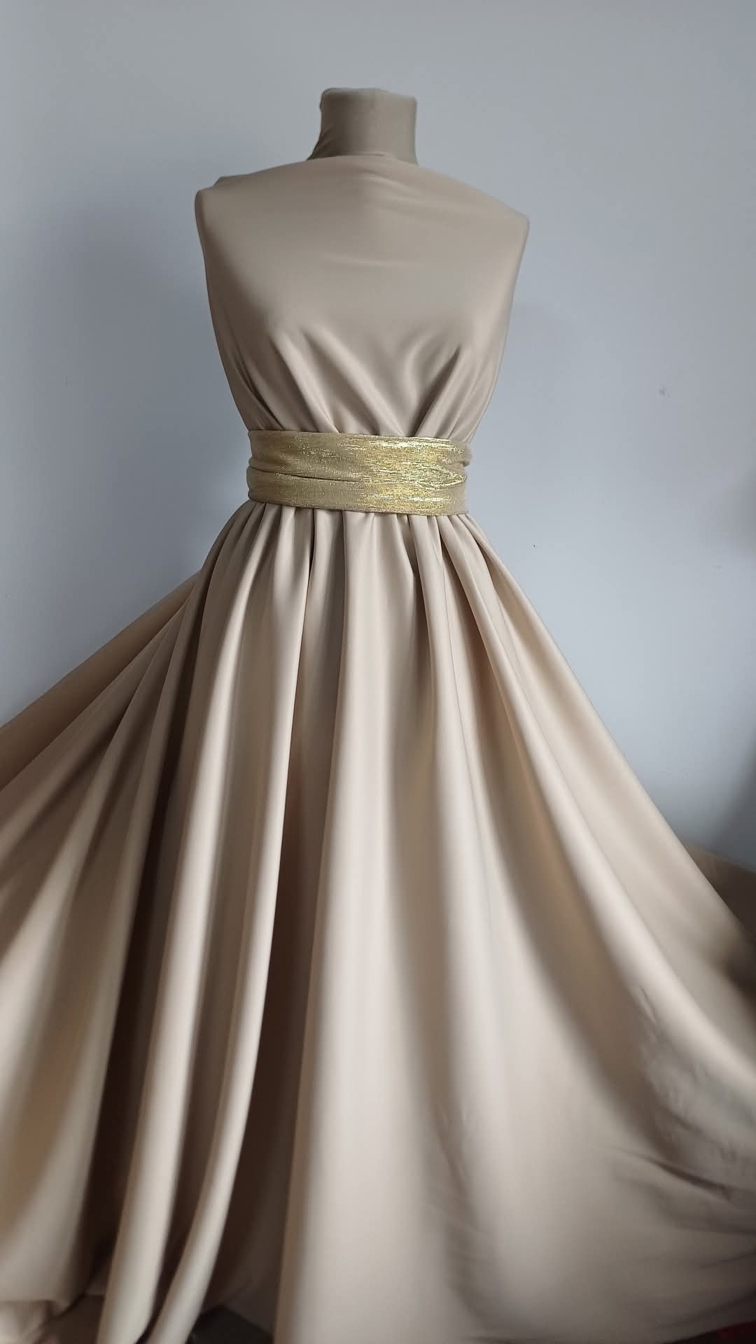Neopren bej – Un material elastic, cu textură plină și aspect neted, ce oferă o fluiditate plăcută și o cădere frumoasă pe siluetă. Nu se destramă, nu necesită căptușeală și se așază impecabil pe formele feminine, punându-le subtil în valoare. Ideal pentru rochii, fuste, bluze sau pantaloni cu un aer modern și confortabil.