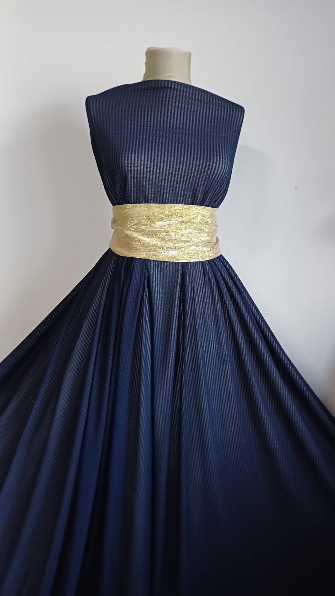 Un material elastic și ușor, cu model discret dungat, ce conferă textură și eleganță fiecărei creații. Versatil și fin, este ideal pentru rochii, fuste, bluze, eșarfe, articole de dans sportiv sau rochii cu multiple volane pentru ședințe foto. Nuanta bleumarin profundă adaugă rafinament și stil, transformând fiecare piesă într-o creație de impact, cu fluiditate și mișcare grațioasă.