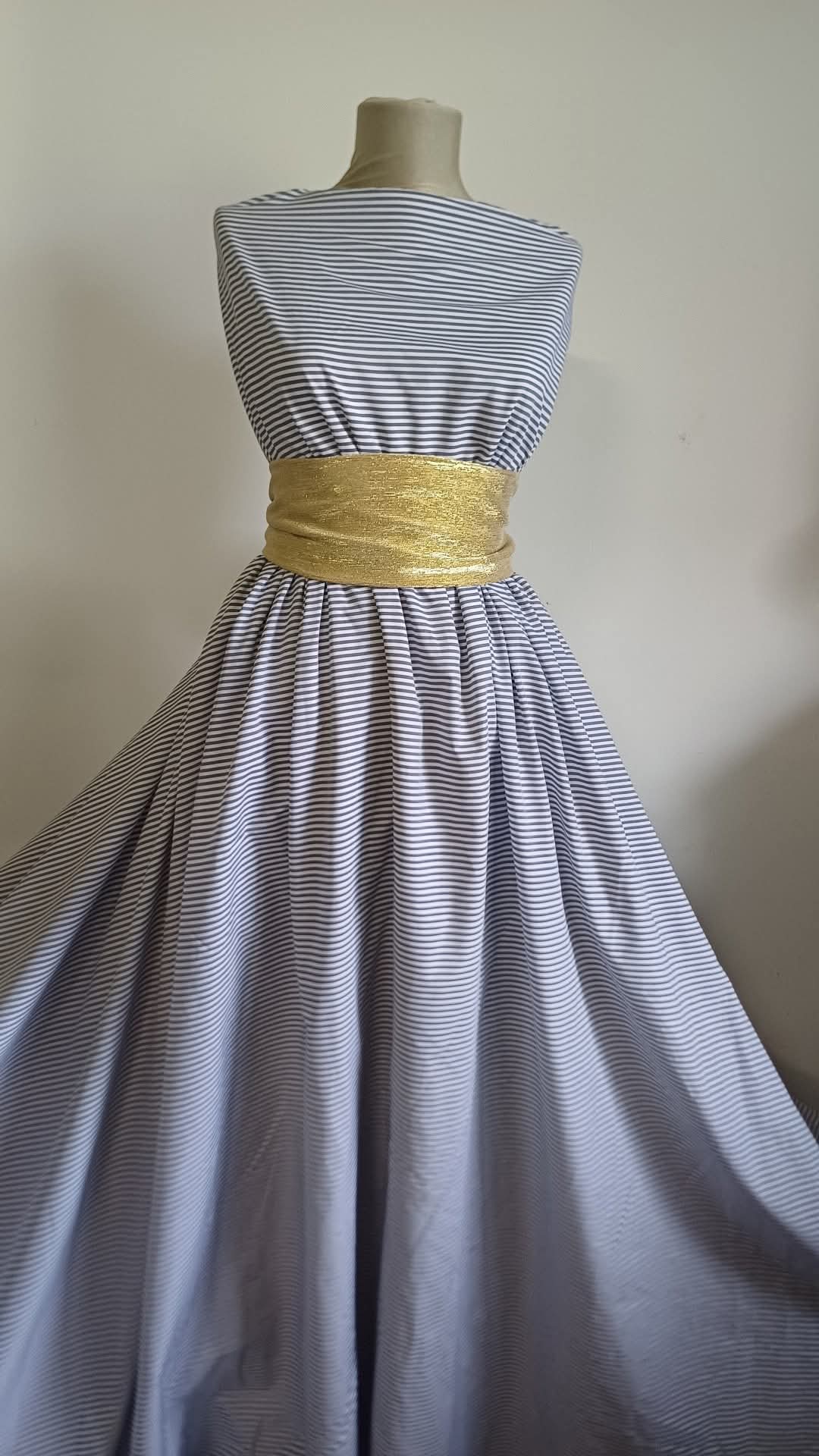 Un material clasic și mereu actual, cu dungi fine în alb și bleumarin, ce conferă un aer proaspăt și rafinat oricărei piese vestimentare. Confortabil, respirabil și ușor de întreținut, este alegerea perfectă pentru rochii lejere, fuste, bluze vaporoase, cămăși bărbătești sau sarafane. Se pretează de minune și pentru pliseuri, pantaloni scurți, uniforme medicale, șorțulețe de grădiniță și articole casual pentru adulți și copii. Un material versatil, ideal pentru proiecte creative și funcționale deopotrivă.