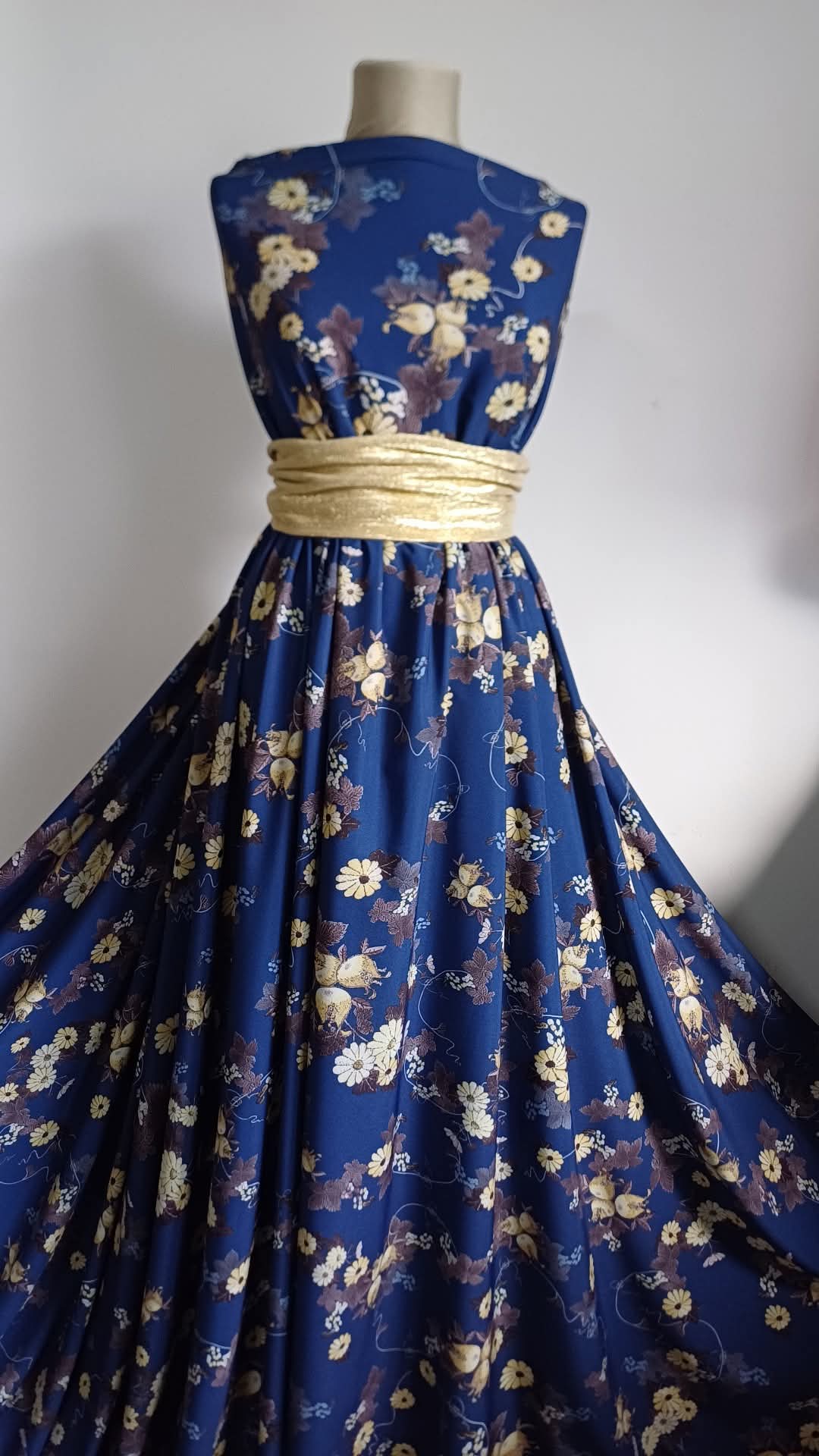 Țesătură din mătase elastică, cu fundal bleumarin intens și imprimeu brodat în formă de buchete florale galbene, delicat și elegant. Moale și catifelată pe piele, nu se șifonează și nu necesită căptușeală. Ideală pentru rochii, fuste, bluze, pantaloni și salopete cu un aer sofisticat.