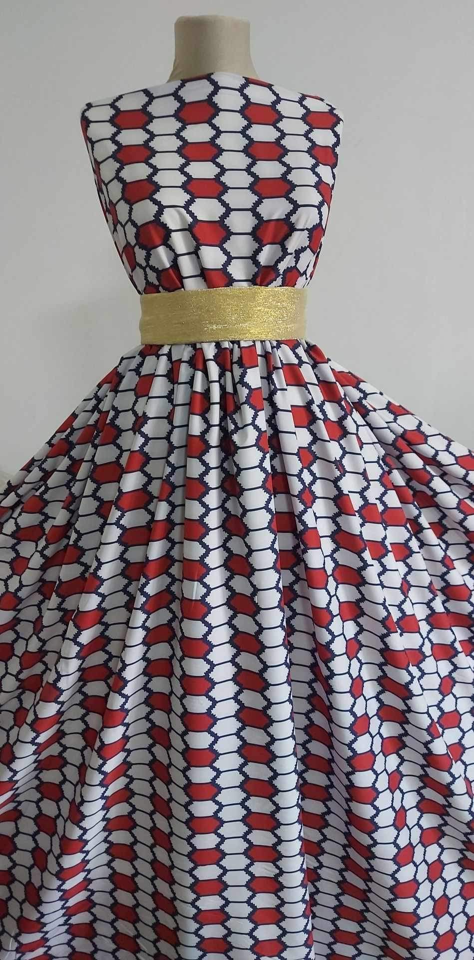 Silky, mătase elastica Hexagoane Rosu/Alb/Bleumarin, nu se șifonează, moale și catifelată pe piele, bună pentru rochii, fuste, bluze, salopete, pantaloni