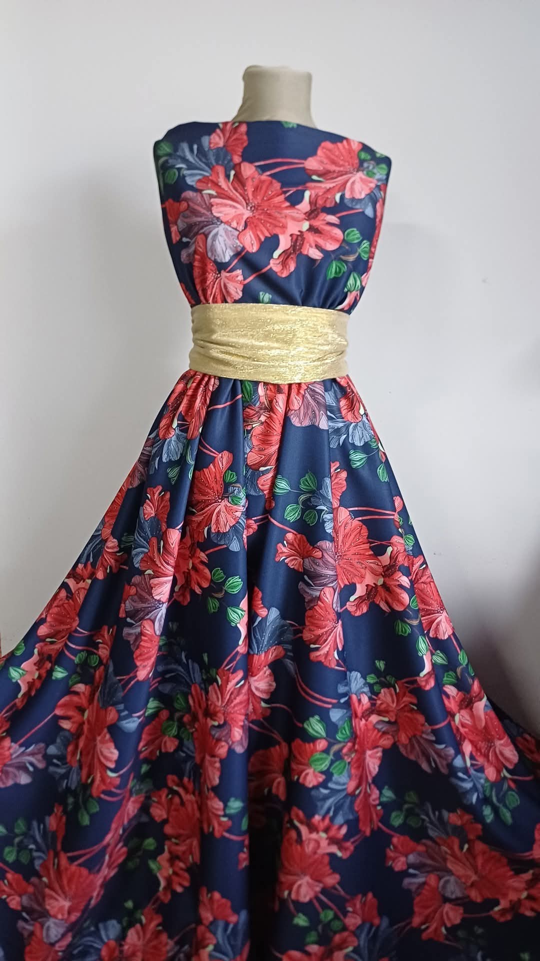 Un material elegant și plin de rafinament, decorat cu un imprimeu superb de crini imperiali roșii pe fond bleumarin. Stofa se lucrează ușor, fiind potrivită și pentru începători, nu se destramă, nu necesită căptușeală și nu se șifonează. Ideală pentru rochii, fuste, pantaloni, compleuri sau salopete, această țesătură îmbină eleganța clasică cu ușurința în prelucrare, oferind rezultate impecabile și confortabile la purtare.