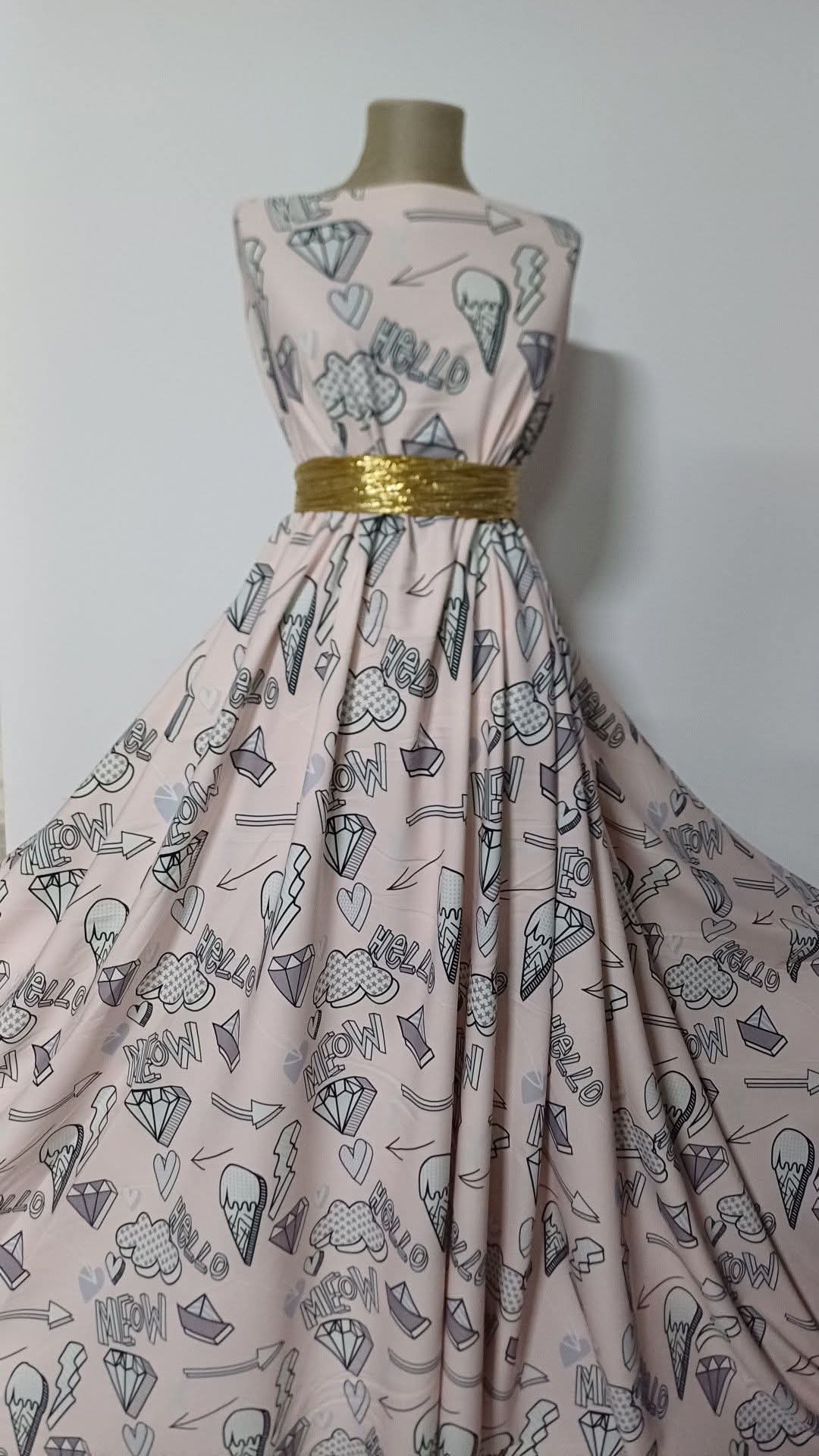 Stofa Barbi HELLO, Roz cu imprimeu gri/negru, plină, elastica se lucrează bine și de către incepatori, nu se destramă, nu necesită căptuseala, nu se sifoneaza, ideala pentru rochii, fuste, taioare.