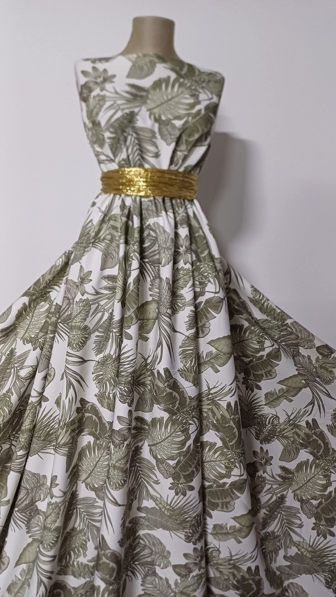 Stofa Barbi Ivory Frunze Exotice Olive, plină, elastica se lucrează bine și de către incepatori, nu se destramă, nu necesită căptuseala, nu se sifoneaza, ideala pentru rochii, fuste, taioare.