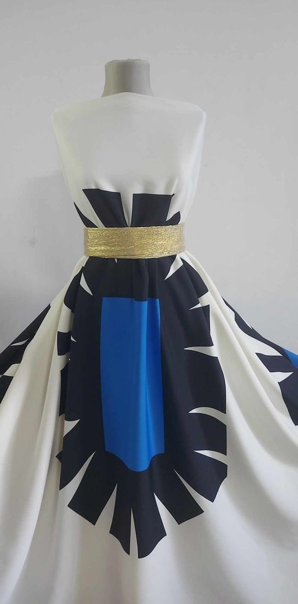 Stofa crepe satinată cu model geometric în culorile ivory, negru și albastru este o alegere minunată pentru diferite proiecte vestimentare și decorațiuni. Iată de ce este potrivită pentru rochii, fuste, bluze, sacouri, salopete și decorațiuni:
