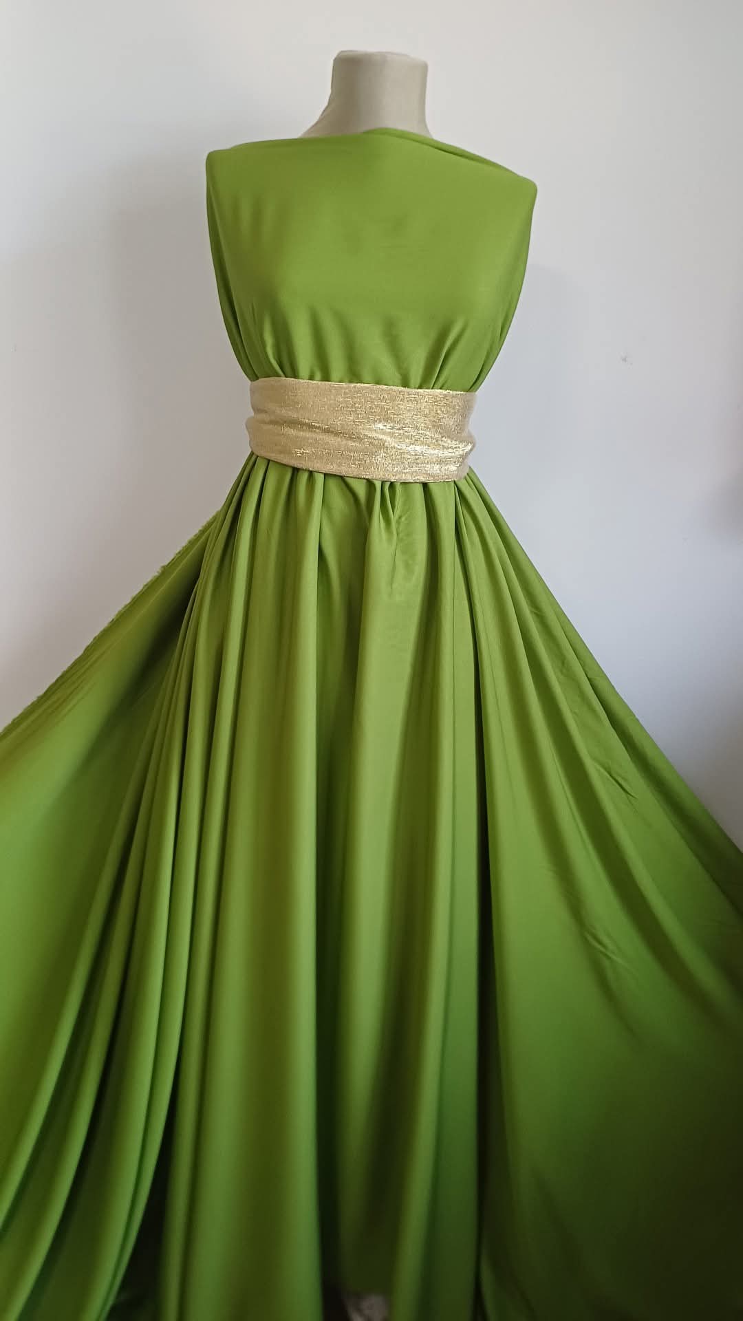 Realizată 100% din fibră vegetală, această stofă din vâscoză impresionează prin textura mătăsoasă, grea și fluidă – o alegere ideală pentru zilele călduroase de vară. Nuanța proaspătă de verde măr adaugă vitalitate și rafinament fiecărei creații vestimentare.