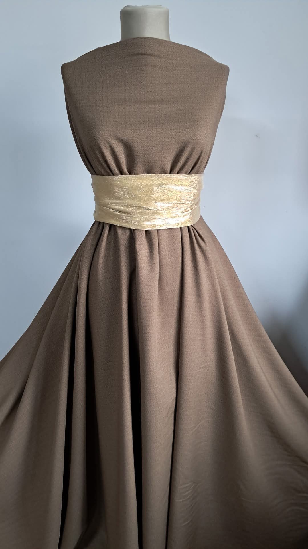 Această stofă englezească într-o nuanță rafinată de bej maroniu, decorată cu un model clasic de pătrățele, emană eleganță discretă și stil atemporal. Cu o textură plină, asemănătoare tergalului, oferă structură și confort, fiind ideală pentru rochii, fuste, sacouri, pantaloni sau salopete. Nu necesită căptușeală și nu se șifonează, ceea ce o face extrem de practică pentru ținute bine definite și ușor de întreținut.