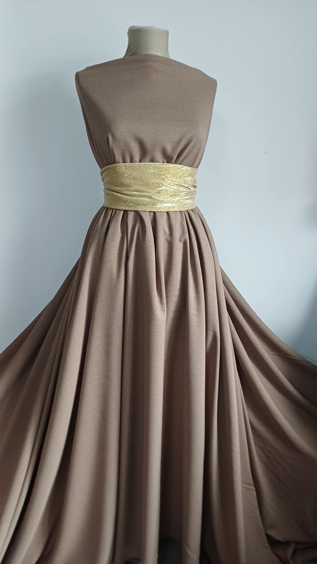 Un material rafinat, cu un aspect clasic și elegant, stofă englezească într-o nuanță caldă de maron deschis, înnobilată cu un discret model în pătrățele. Este o țesătură densă și plină, asemănătoare cu tergalul, ce conferă ținută și confort pieselor vestimentare. Ideală pentru rochii, fuste, sacouri, pantaloni sau salopete, această stofă nu necesită căptușeală și are avantajul de a nu se șifona ușor, oferind un aspect îngrijit pe parcursul întregii zile.