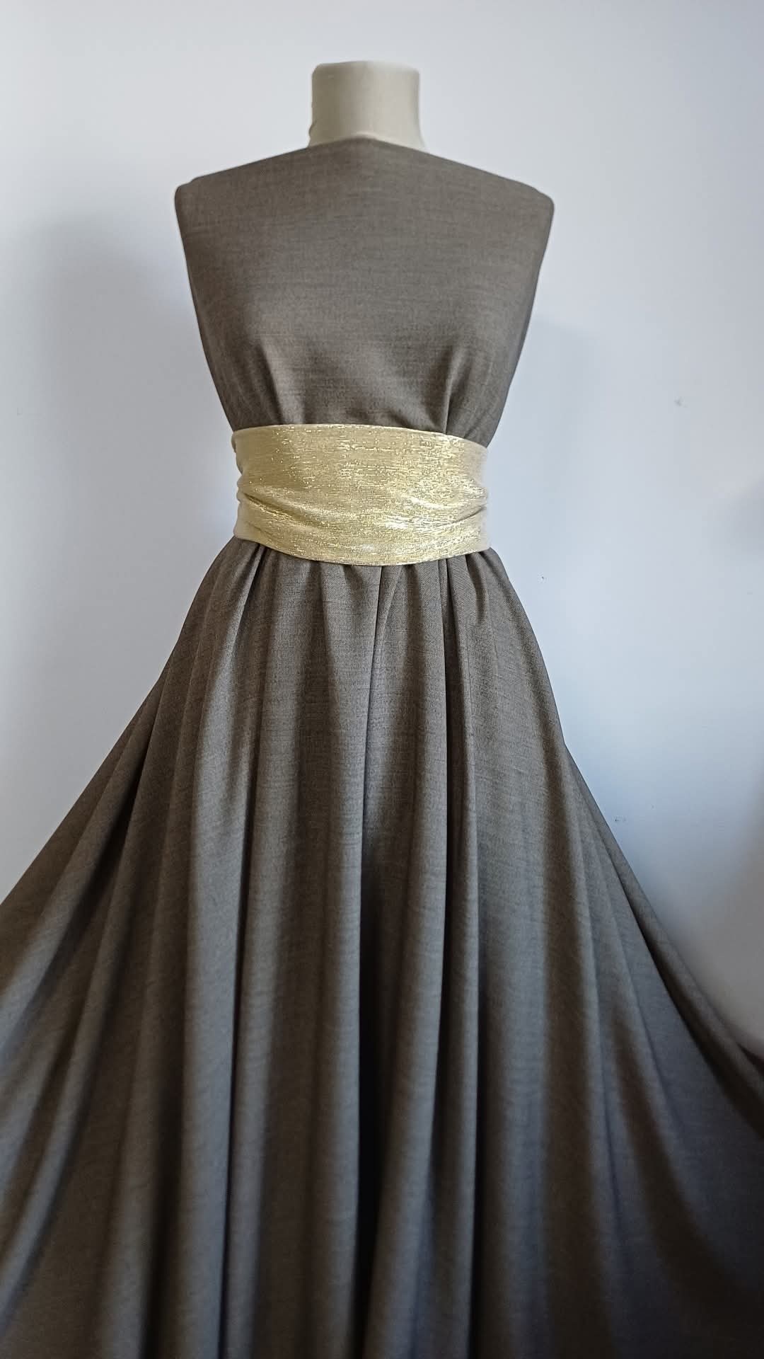 O țesătură de calitate superioară, plină și structurată, cu fluiditate delicată și elasticitate ușoară, ce oferă confort și libertate de mișcare. Ideală pentru rochii, fuste, sacouri, pantaloni sau salopete, acest material nu necesită căptușeală și nu se șifonează, păstrându-și forma și aspectul impecabil. Modelul „sare și piper” în nuanțe maron conferă stil și rafinament, potrivit pentru ținute elegante și versatile.
