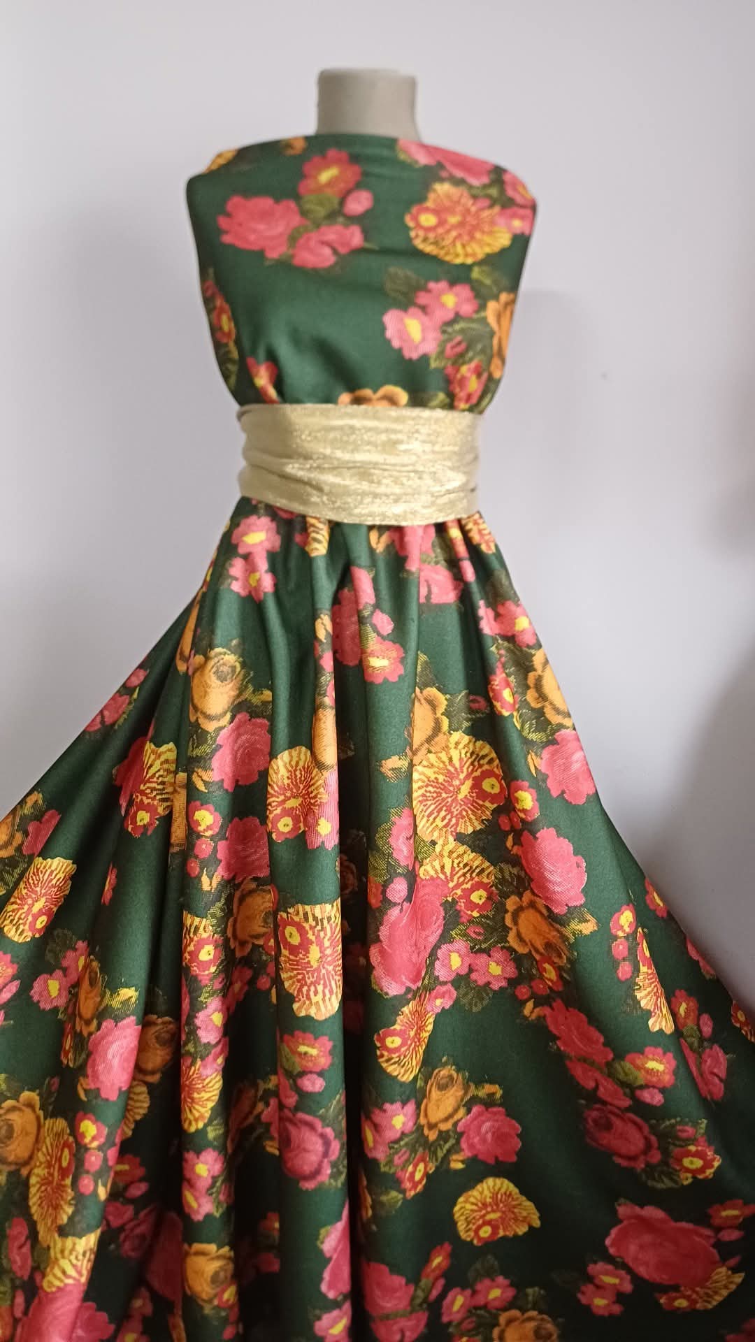 Ștofă Imprimată Verde cu Trandafiri Roz și Galben