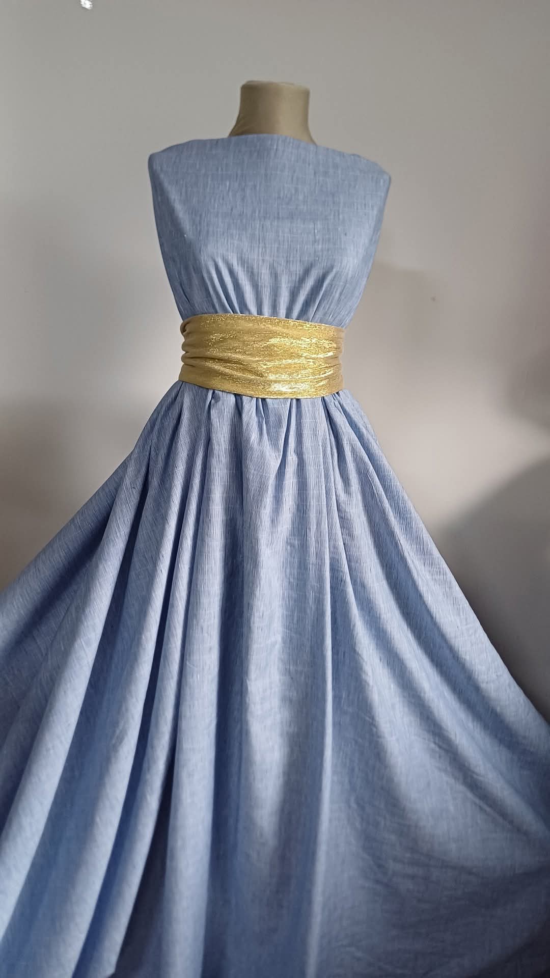 O țesătură naturală, de calitate superioară, adusă din Italia, într-o nuanță plăcută de bleo cu dungulițe fine, care adaugă un aer clasic și proaspăt. Materialul este ușor mai gros decât un poplin obișnuit, oferind o structură frumoasă și o ținută elegantă fără a necesita căptușeală.