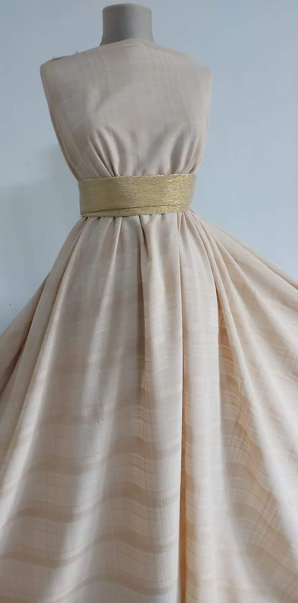 Țesătura mătăsoasă bej cu model din lucrătură este un material elegant și sofisticat, perfect pentru diverse utilizări. Textura sa fină și modelul delicat conferă un aspect luxos, ideal pentru rochii, fuste și bluze. De asemenea, această țesătură este excelentă pentru decorațiuni, aducând un plus de rafinament oricărui spațiu. Versatilitatea și frumusețea sa o fac potrivită pentru numeroase proiecte de modă și design interior.