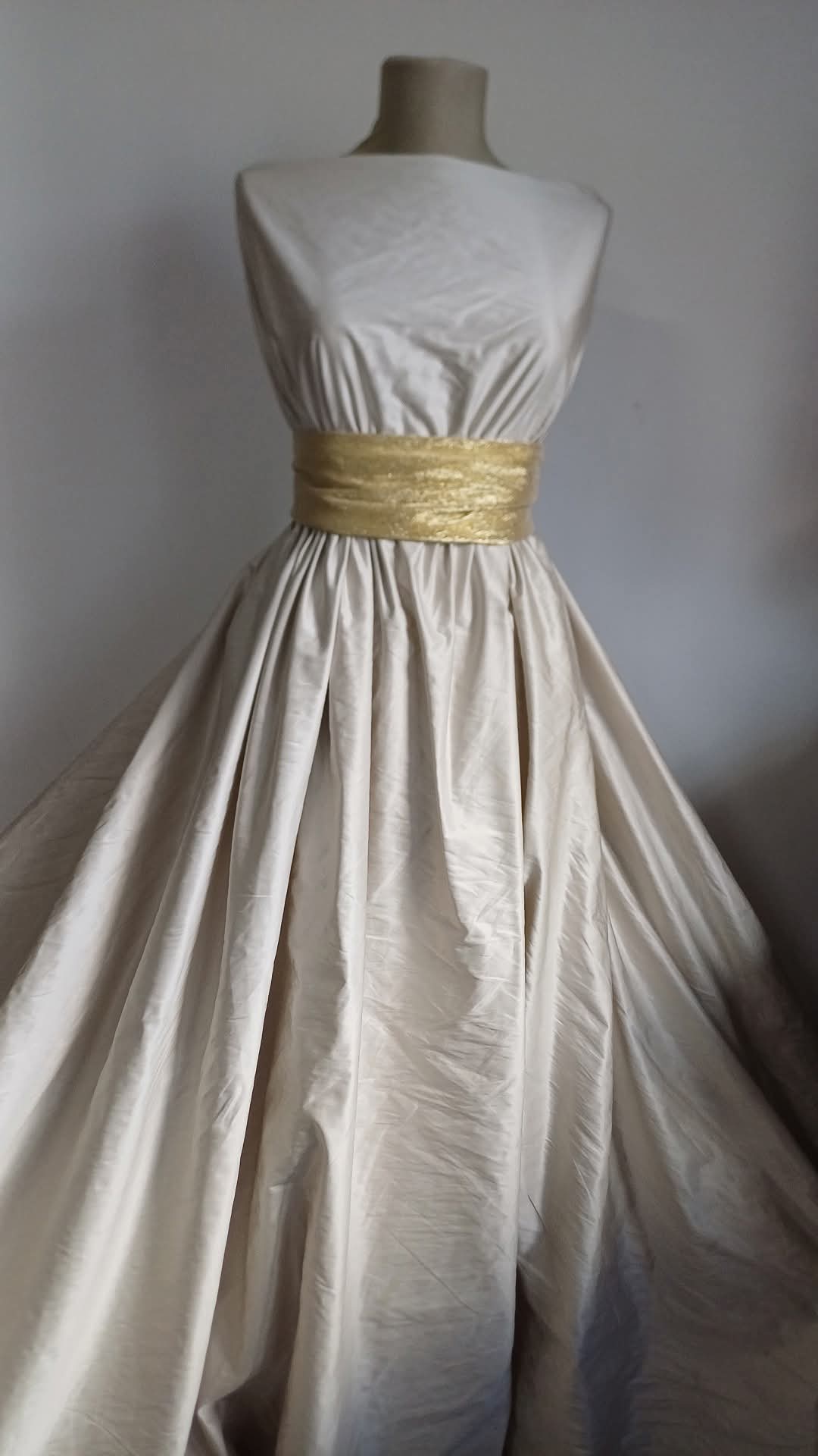 Această țesătură mătăsoasă în nuanță bej sidefiu are o textură delicată, ușor crășuită, care îi conferă un efect vizual rafinat. Realizată din fibre sintetice cu aspect similar taftalei, materialul are o ținută frumoasă și un luciu discret. Ideală pentru rochii elegante, fuste, bluze cu personalitate sau articole decorative deosebite. O alegere inspirată pentru creații cu un aer sofisticat și modern.