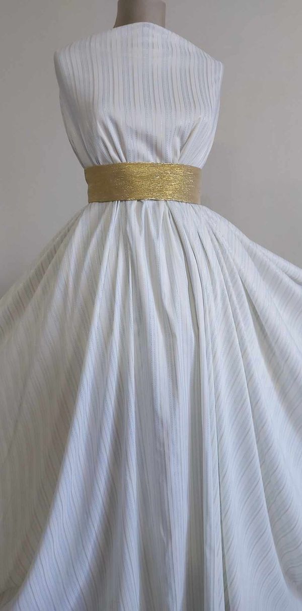 Stil și ocazii: Tesătura mătăsoasă ivory cu dungi sidefate și fire aurii și bleo în relief se potrivește perfect pentru evenimente speciale, precum nunți, petreceri sau serate elegante. De asemenea, poate fi folosită pentru creații de zi cu zi, pentru un aspect rafinat și sofisticat.