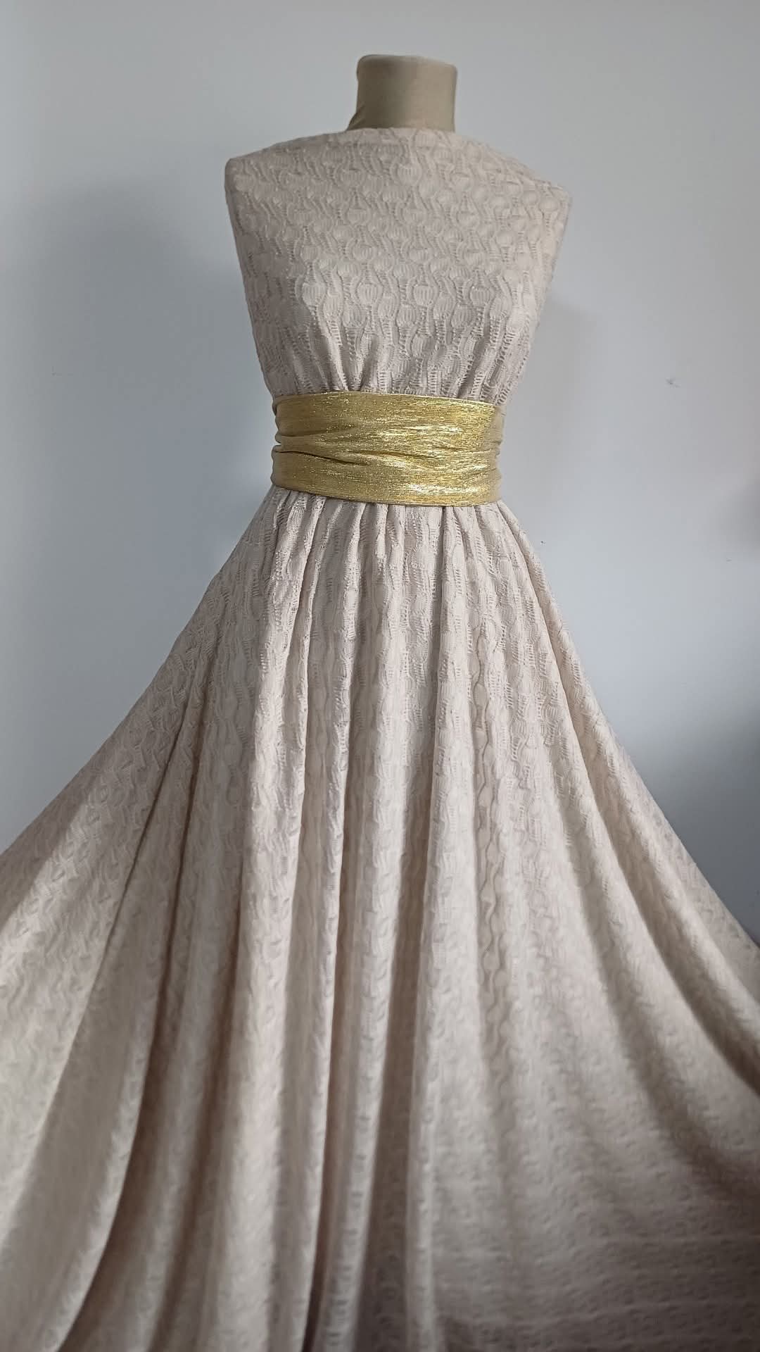 Un material cu un aer delicat și rafinat, acest tricot dantelat în nuanță de bej deschis este alegerea ideală pentru creații vestimentare elegante și confortabile. Textura elastică și fină îl face potrivit pentru rochii fluide, fuste lejere, bluze cu croi romantic, malete plăcute la purtare sau cardigane ușoare. Versatilitatea sa îl recomandă și pentru accesorii moderne precum turbane sau șaluri cu un plus de stil. Este un material ce adaugă un strop de feminitate și subtilitate oricărei piese vestimentare.