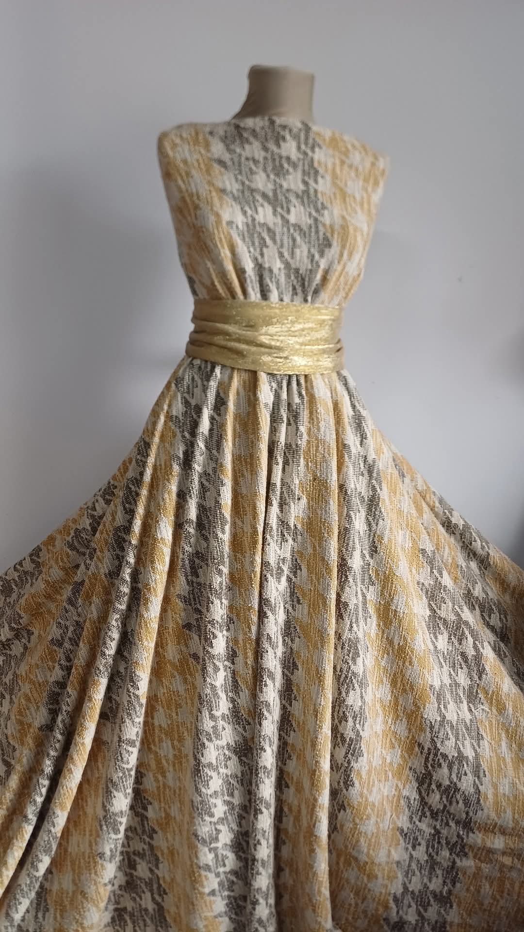 Tricot tip pulover – model Picior de Cocoș Mustar/Ivory/Negru – O țesătură cu personalitate, ce îmbină armonios tonurile de muștar, ivory și negru într-un clasic model Picior de Cocoș reinterpretat cu un aer modern. Moale și confortabil, acest tricot este ideal pentru rochii, fuste, bluze, malete, cardigane, turbane sau șaluri, aducând un plus de stil și rafinament fiecărei piese vestimentare.