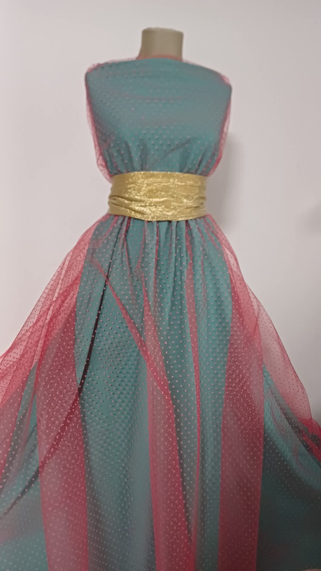 Delicat și romantic, acest tull elastic în nuanță frez este împodobit cu buline roz deschis din catifea, adăugând un plus de farmec oricărei creații. Textura fină și elasticitatea îl fac ideal pentru rochii vaporoase, fuste feminine, bluze elegante sau decorațiuni cu un aer jucăuș și rafinat. Un material care inspiră gingășie și stil.