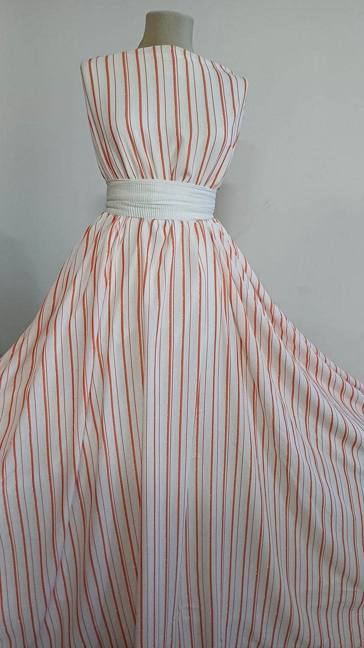 Viscoza fină cu dungi albe și roșii și fir auriu este o opțiune elegantă și rafinată pentru diferite proiecte vestimentare și de decor. Iată cum poți folosi această țesătură în creațiile tale: