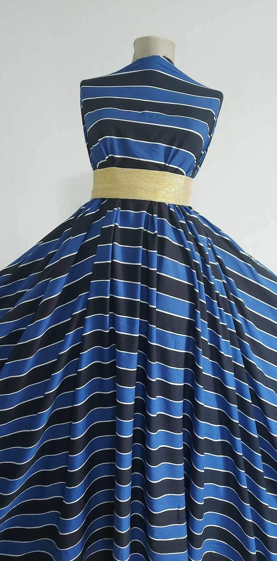 Viscoza spun dungi în negru, alb și albastru este o alegere perfectă pentru sezonul cald, datorită simțului său răcoros și confortabil pe piele. Materialul este ideal pentru o varietate de articole vestimentare, inclusiv rochii, fuste, bluze, cămăși și caftane, oferind o combinație armonioasă de culori clasice. Este potrivit și pentru articole de plajă, datorită respirabilității și lejerității sale. Această țesătură adaugă un aer proaspăt și vesel garderobei tale de vară, fiind versatilă și ușor de integrat în diferite stiluri și ocazii.