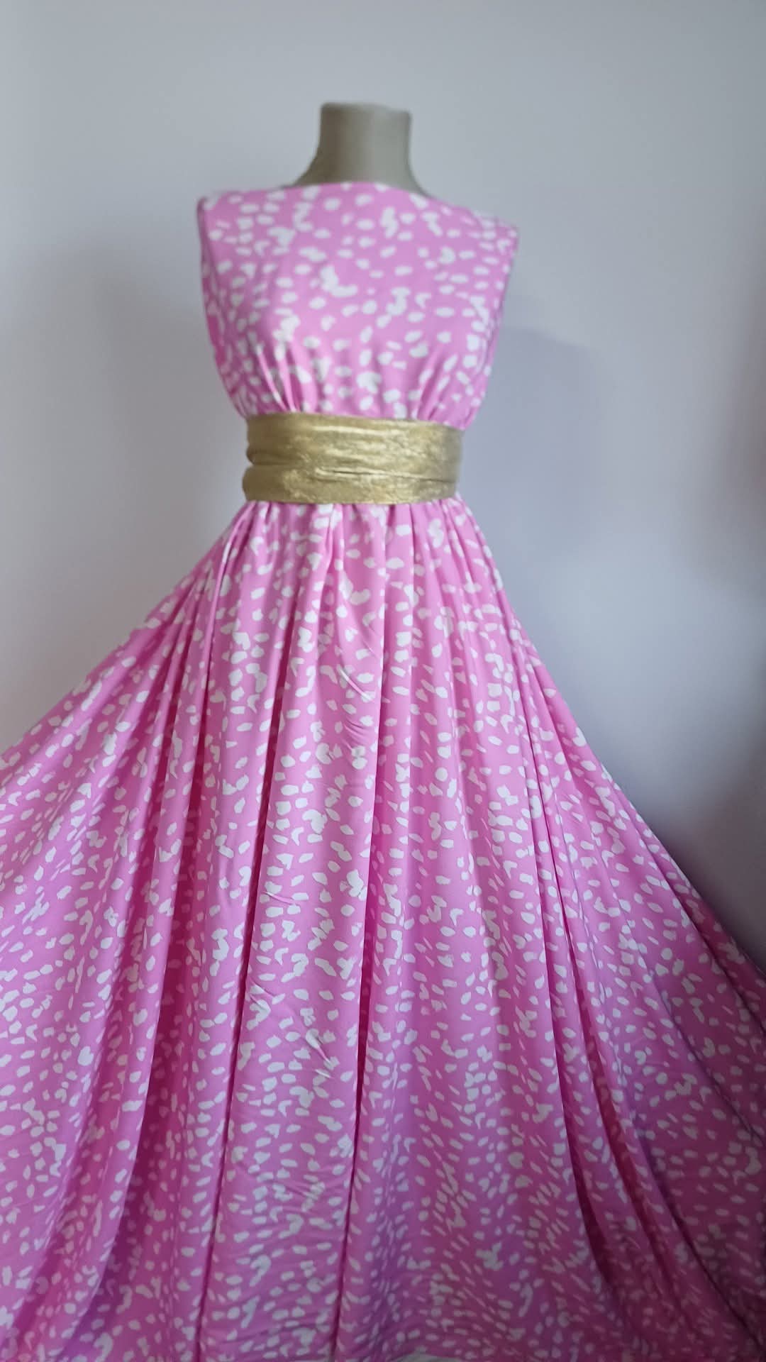 Viscoza Spun imprimeu ROZ cu Pete Albe, fibră vegetală 100%, calitate Lux, moale și catifelată pe piele, bună pentru rochii, fuste, bluze, pantaloni, salopete