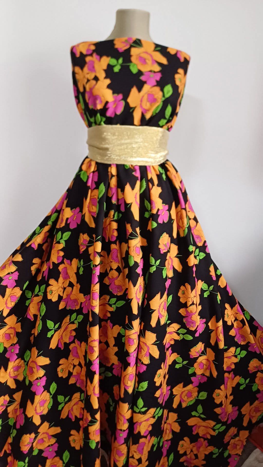 Viscoza Spun Negru cu Trandafiri Portocalii/Magenta, moale și catifelată pe piele, bună pentru rochii, fuste, bluze, pantaloni, salopete