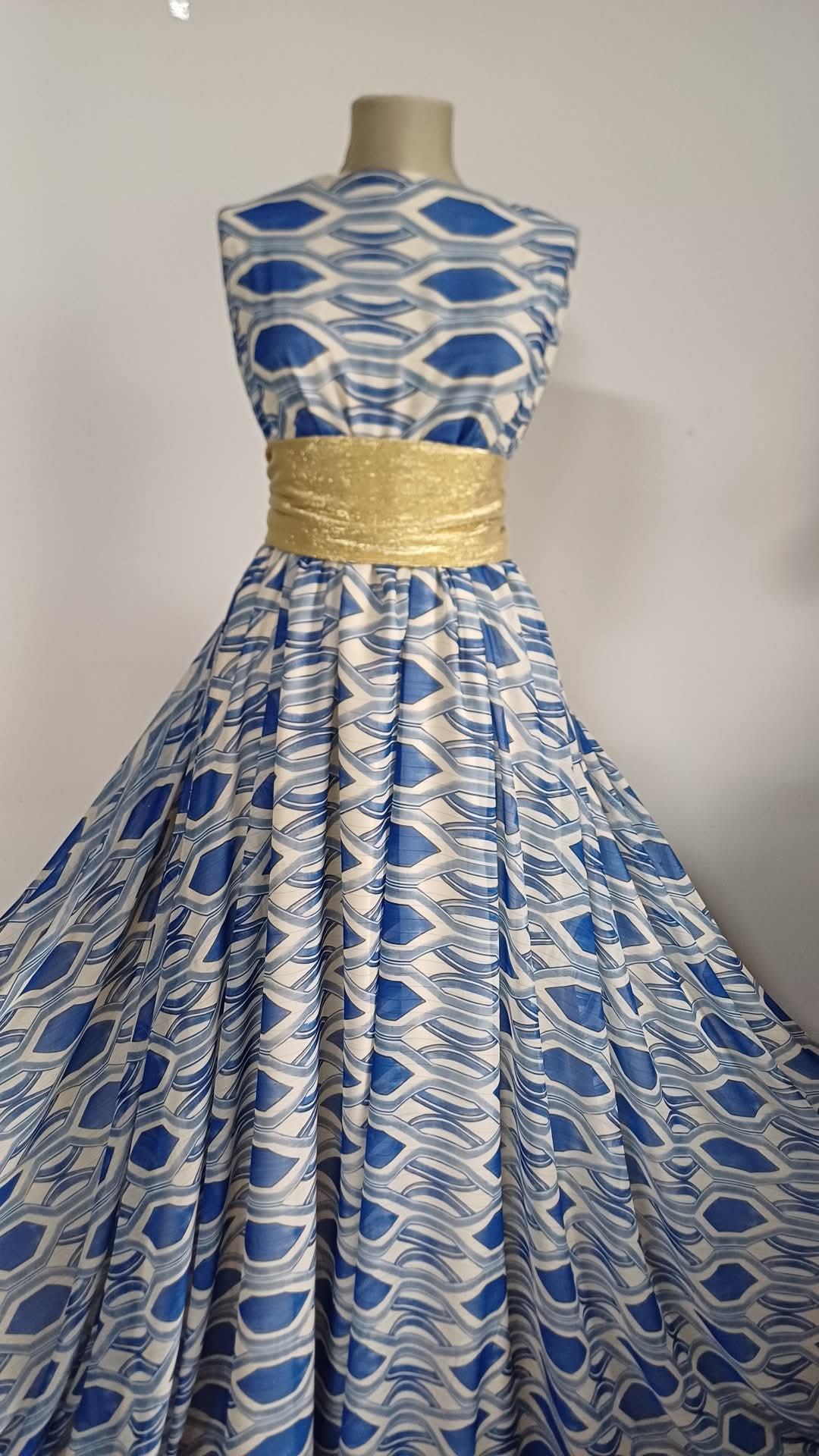 Un material vaporos și delicat, cu un design rafinat compus din împletituri fine și romburi albastre, accentuate de un fir lame auriu subtil, ce adaugă un strop de strălucire. Ușor, diafan și decorativ, acest voal este ideal pentru rochii, fuste, bluze, volane sau decorațiuni. Perfect pentru ținute feminine și detalii cu personalitate.