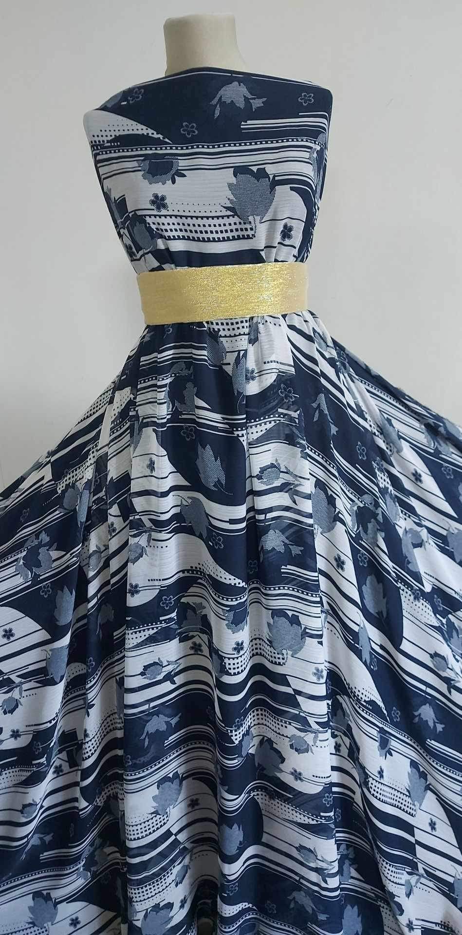 Voalul chiffon crinckle în nuanțe de bleumarin și alb, cu imprimeu de frunze rare, este un material ușor și cu o textură ușor încrețită, perfect pentru crearea de rochii, fuste, bluze și eșarfe. Datorită aspectului său curgător și aerisit, acest material conferă hainelor un look elegant și relaxat, potrivit atât pentru ținute casual, cât și pentru ocazii speciale. Imprimeul de frunze rare adaugă un element subtil de naturalețe și prospețime, fiind ideal și pentru decorațiuni delicate.