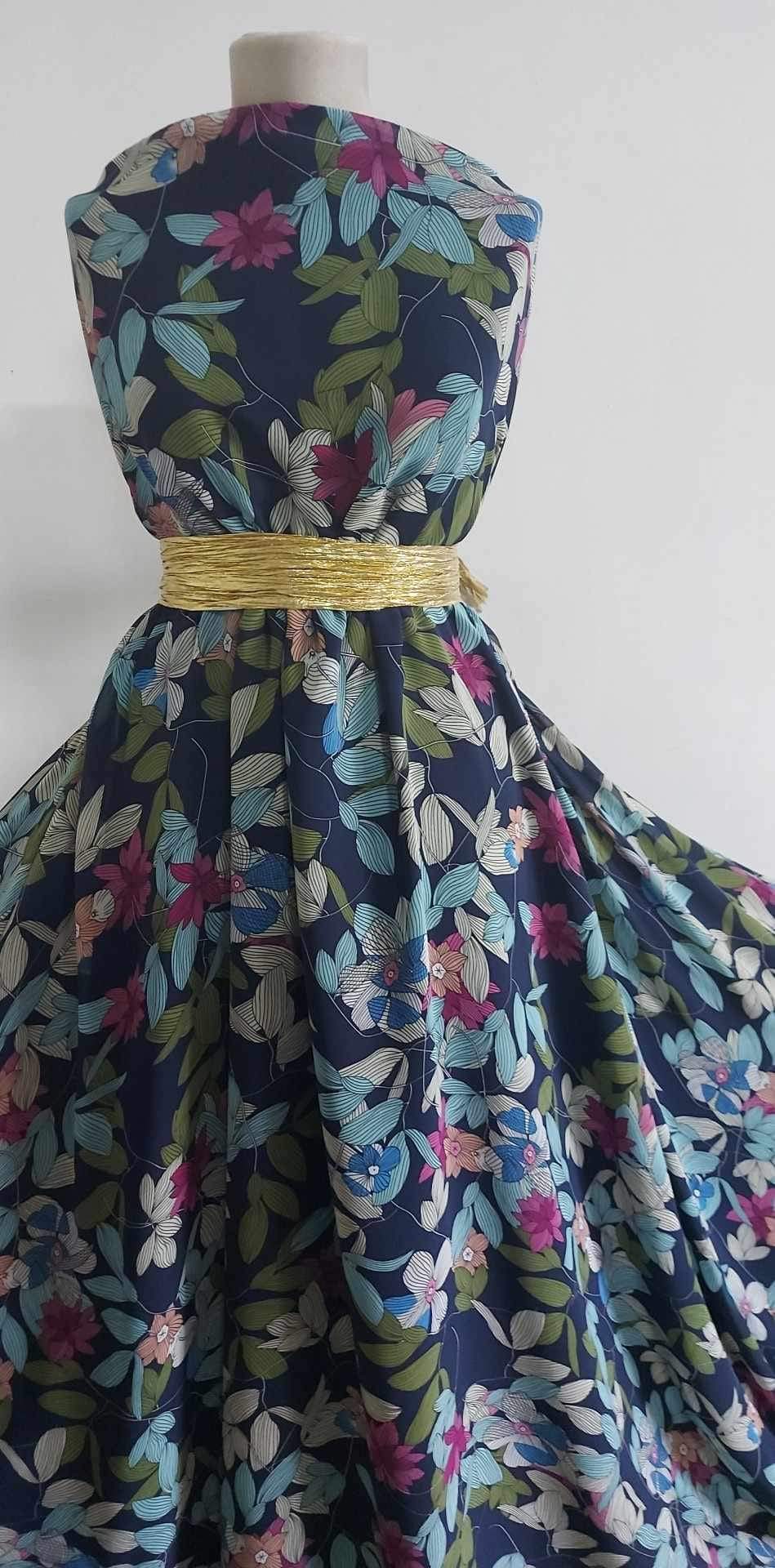 Voal chifon Bleumarin Frunze Bleo Flori Magenta, curgător, bun pentru rochii, fuste, bluze, esarfe, decorațiuni