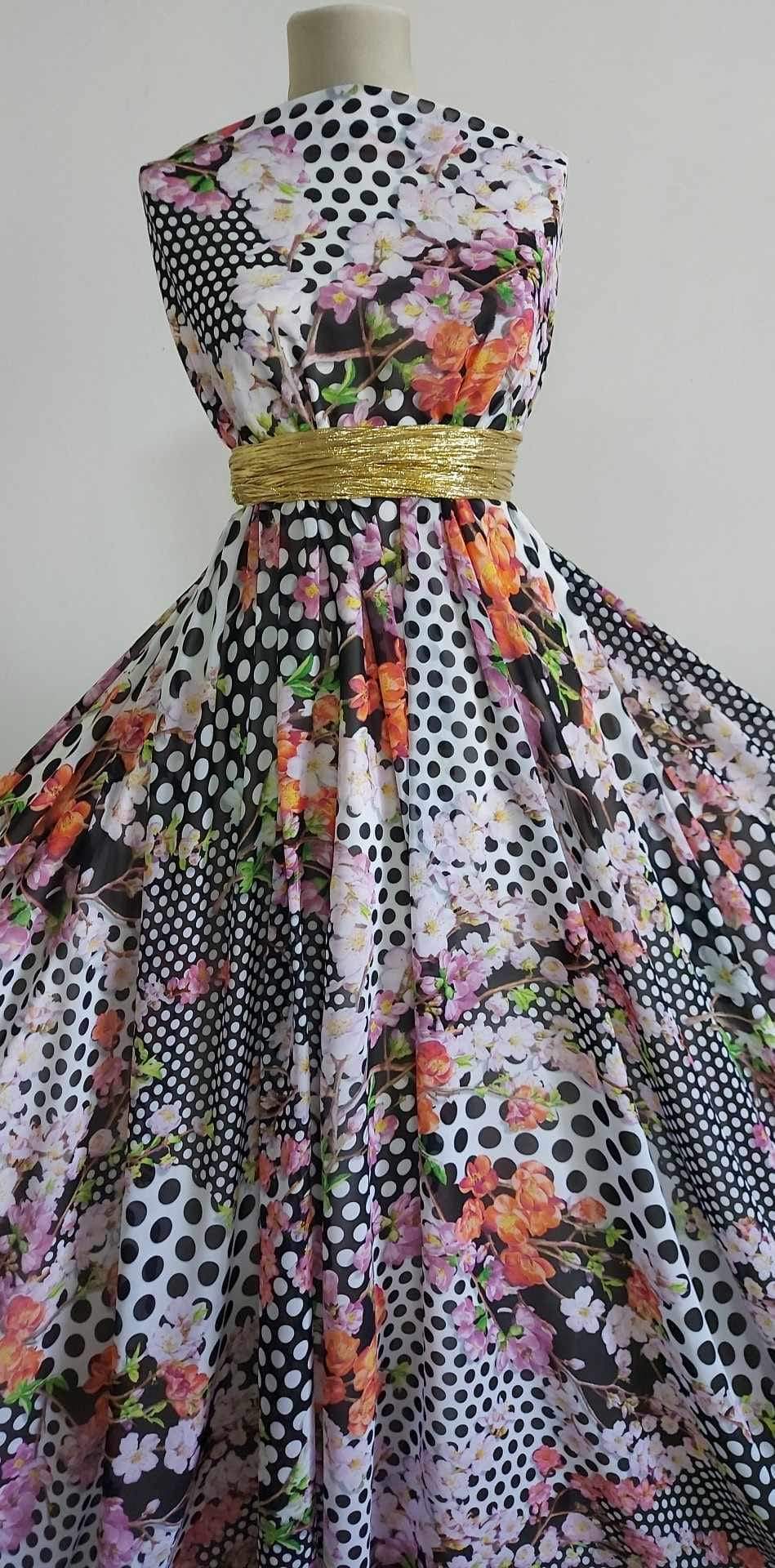 Voalul chifon superb, negru cu buline și orhidee, este un material curgător, perfect pentru rochii, fuste, bluze, eșarfe și decorațiuni. Cu o textură ușoară și fluidă, acest voal adaugă o notă de eleganță și rafinament, fiind ideal pentru creații vestimentare sofisticate și atrăgătoare. Designul cu buline și orhidee aduce un contrast chic și modern, potrivit pentru diverse ocazii.