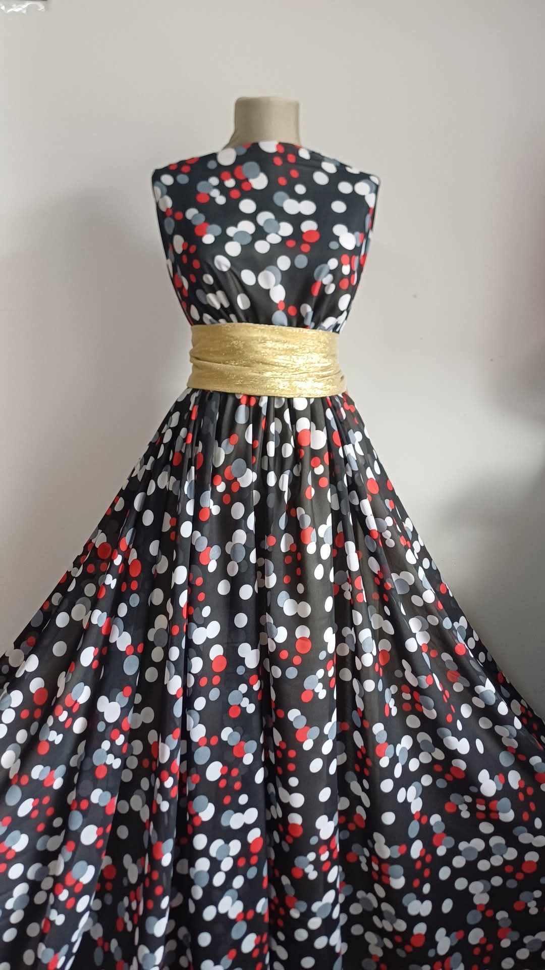 Un material lejer și curgător, cu un fundal negru profund decorat cu buline jucăușe în nuanțe de roșu, gri și alb. Combinația de culori conferă un echilibru perfect între clasic și modern, făcând din acest voal o alegere inspirată pentru creații pline de personalitate.
