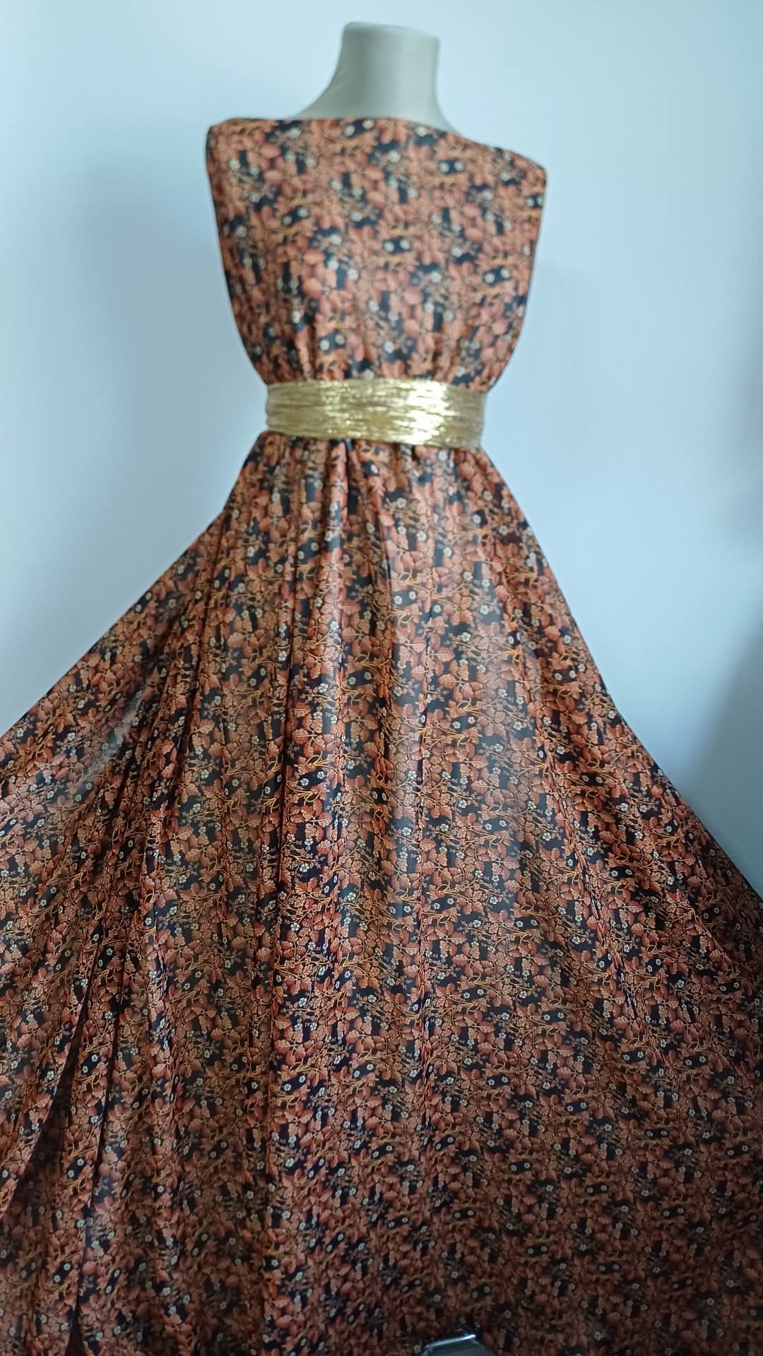 Acest voal chiffon negru, decorat cu floricele discrete în tonuri de maron, este ideal pentru ținute vaporoase și detalii rafinate. Are o textură fină, delicată și plăcută la atingere, potrivit pentru rochii, fuste, bluze, eșarfe, dar și pentru decorațiuni cu stil.